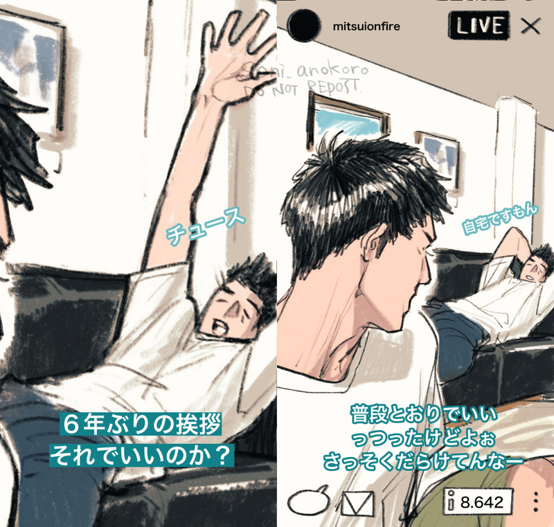 🔥「(略)今日は予告通り、🏀宅飲みライブ企画、第8弾…本日、オレは!なんと!元日本代表で元千葉ガッツ所属の🎣と!元日本代表…つーか最近はテレビとかも出てる🏄の家に!きてます!(略)で、夕方の撮影から帰ってくる🏄を待つ間、🎣と話そうってわけだ。🎣を久しぶりに見る、って人も多いんじゃね?メディア露出が、6…?(振り返って🎣に確認)6年ぶり、らしいんだよ。それまで何やってたって話だよな、うん。まぁ、いつもどーりダラダラやりながら話してくんで…🌸なんか、今勝手に冷蔵庫漁ってるくらいだし…皆さんもコメント欄にテキトーに質問、入れてってください」