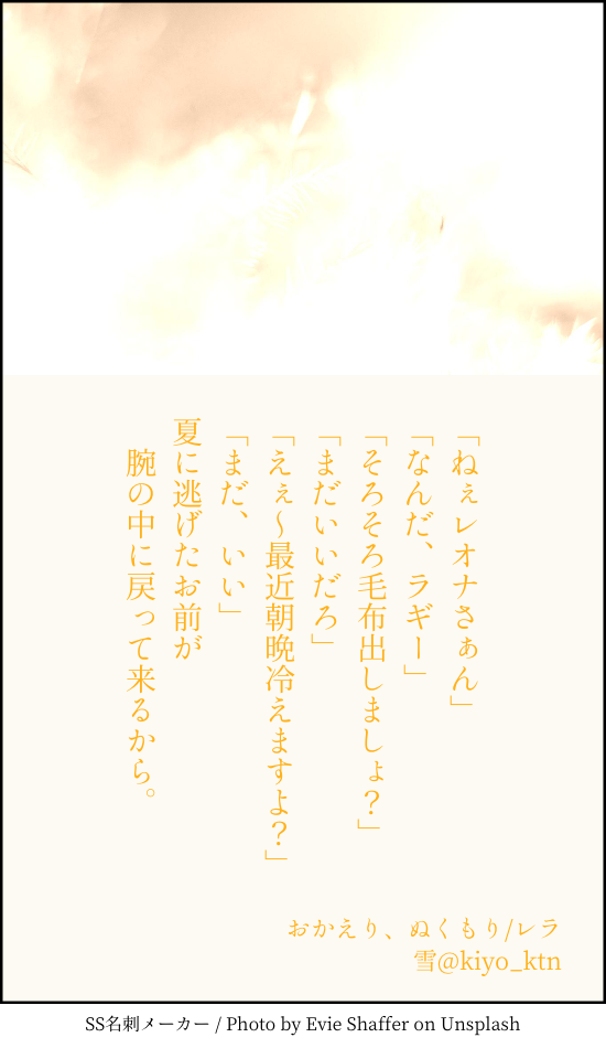 きよむ☆quiet followDONE一緒に寝ているレオラギ。「冷えた夜にお前の熱は心地よい」たぶん早々にラくんが毛布引っ張り出してくる。 ##twstbl-ss Tap to full screen (size:550x950).Repost is prohibited Let's send reactions! freqpopularsnackothersPayment processing Replies from the creator Follow creator you care about!☆quiet follow きよむSPOILER9/22禊肥前くんネタバレ きよむSPOILER勢いで背中乗っちゃったけどどうしよう……ってか、どこここ きよむSPOILERバグかな!?www きよむSPOILER早く服着て きよむSPOILER飛び込む!?ここを!? きよむDONE「いつまでもんな寒ぃとこいんじゃねぇよ」# むつひぜ版創作60分一本勝負 さんのお題「ゆびさき」お借りしました。むつひぜ初めて描きましたね!む、むつひぜと言い張る……。