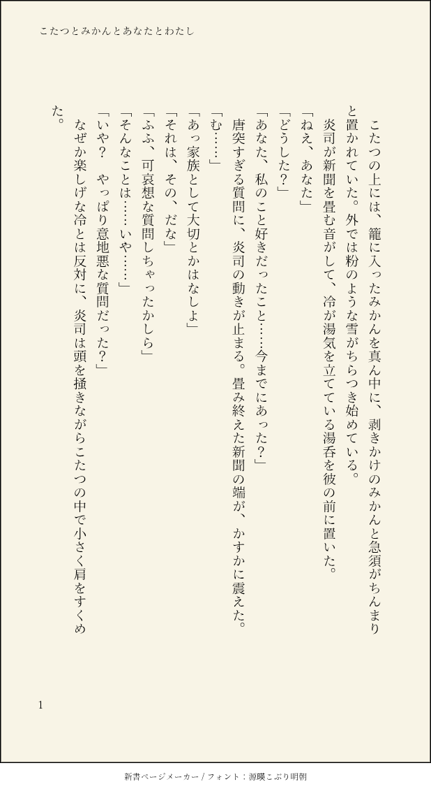 mgnyannyan☆quiet followDONE炎冷「こたつとみかんとあなたとわたし」※8年後以降2025.11.09 show all(+3 images) Tap to full screen (size:618x1132).Repost is prohibited Let's send reactions! freqpopularsnackothersPayment processing Replies from the creator Follow creator you care about!☆quiet follow mgnyannyanDONE炎冷SS「彼のヒーロー理論」※8年後以降「あなたにあいにいけますか?」つづき2025.12.03 7 mgnyannyanDONE炎冷「あなたにあいにいけますか?」※8年後以降2015.11.18 7 mgnyannyanDONE炎冷「恋も愛もぜんぶ」※8年後以降2025.11.14 5 mgnyannyanDONE炎冷「幾度目の春」※8年後以降2025.11.11 6 mgnyannyanDONE炎冷「こたつとみかんとあなたとわたし」※8年後以降2025.11.09 4 mgnyannyanDONE炎冷「氷上を歩く」※お見合い時の小話2025.11.08 4 recommended works @tekit0unDOODLE軍師のあとの漫画 5 おひなDOODLEクロはる!密着度高めなので背後注意センシティブ要素無いに等しいので期待せずに見てね 2 6ka_1DONE【一カラ/班マフィ/ドンマフィ】 『元◯◯な班長さんとつれないマフィア(仮)』のリライト再録⑧「7 years ago」「with his songs」加筆修正前のものはpixivに全文掲載していますhttps://www.pixiv.net/novel/series/1052682 20 awaawaburoDOODLEぶるぽんまとめ。新年からバレンタイン付近まで。今回はぶるぽんたちではないのもはいってます。ぬいっぽく描くのにハマってたときの⛪😈ちゃんぬい、🛩️AUぬい、みゃおちん&ふーにゃおぬいなど。ぬいはカワイイネェ🥹 16 tonoyan589SPOILER都市伝説課おまけシナリオげんみ❌あまりにも最高すぎる戦闘ログキョウハルってかっこいいんすよ 3 Cathartes_VenousDOODLEPassword question- R18? Y/Njust nsfw doodles of my Demi-primarch player character or a Dnd campaign and the 1 npc I am too obsessed withCharacters- Fynn Briar (Aasimar), Jin (Changeling) 5 haru_325_912DOODLEディープブルーにキラめいて念のため現行未通過✖うちのアイドルさんがとてもかわいいというらくがき 3 northerndog6DOODLE⚔️🏢 3 Abel_RoidMEMOCoC『あどけなさと、ざわめく君のせいしん』KP/KPC:生月秀真さん/甘濃 羅逸くんPL/PC:あべる/Alexia・Breitnerクトゥマス継続!誕生日の2/18に回して貰いました!大きい羅逸くんと小さい羅逸くんにお祝いして貰ってハッピーだぞ✌