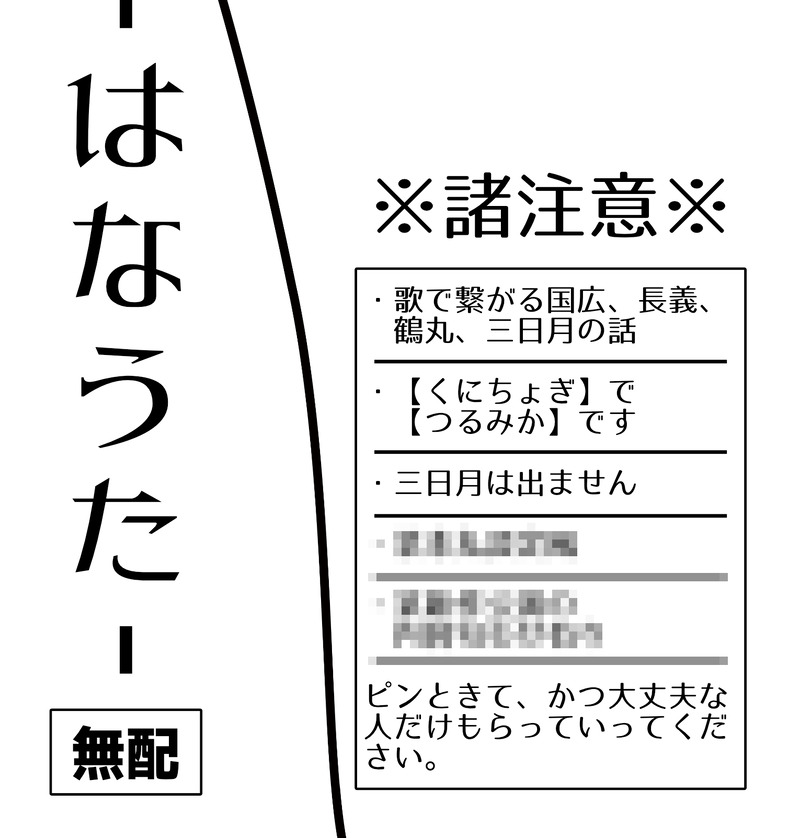 えだつみ☆quiet followMENU脳が焼かれたので無配が出来てしまいましたが取り扱いがセンシティブなのでピンとくる方だけどうぞパス:〇〇〇〇の寝ざめ(※ローマ字4字)こういう内容の無配をそっと1月インテで配布します、のご案内です。 show hide show all(+1 images) Tap to full screen (size:1530x1603).Repost is prohibited Let's send reactions! freqpopularsnackothersPayment processing Replies from the creator Follow creator you care about!☆quiet follow えだつみMENU脳が焼かれたので無配が出来てしまいましたが取り扱いがセンシティブなのでピンとくる方だけどうぞパス:〇〇〇〇の寝ざめ(※ローマ字4字)こういう内容の無配をそっと1月インテで配布します、のご案内です。 2 えだつみMENU2024/5/5 金瑠璃のお品書き(委託分)の詳細です。くにちょぎ+●●●ちょぎの3P本くに→ちょぎ以外に●●●→ちょぎへの挿入表現もありますので大丈夫な方のみどうぞ!ワンクッション後に詳細です。 えだつみPROGRESS関係に問題のある国広と長義の話(予定)本になるまでに全面改稿の可能性があります 7651 えだつみPROGRESSクレーマー顧客極国広×政府カスタマーセンター所属偽監査官長義不備で山姥切長義が配布されなかった本丸で長義が監査官のフリをするところから始まるくにちょぎ※政府関係独自設定あり※審神者が喋ります作業進捗なので本になるときには大幅改稿の可能性もあります間に合いますように 20241 えだつみPROGRESS書き下ろしと言いつつ11月23日のWEBオンリーで全文公開する予定ちょっと不穏な状況で三日月と鶴丸が邂逅して何やかやする話 5457 えだつみPROGRESSただの同僚同士のつるみかの本丸に二振り目が顕現してなんやかんやする話(予定)発行の際に大幅改稿の可能性がありますただの作業進捗です 17839