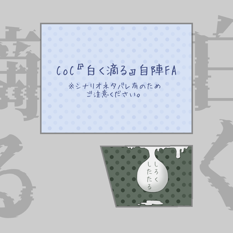 たかつき☆quiet followSPOILERクトゥルフ神話TRPG 『白く滴る』自陣FA2枚目以降はシナリオのネタバレを含むためご注意ください。※一部トレス使用。 show all(+1 images) Tap to full screen (size:768x768).Repost is prohibited Let's send reactions! freqpopularsnackothersPayment processing Replies from the creator Follow creator you care about!☆quiet follow たかつきMEMO探索者の髪と目の色パターン。キャラシと違う子もいるかもしれない。 たかつきDOODLE「Rembrandt」自陣FA。ありがとうございました! 2 たかつきSPOILER鰯と柊。自陣FA別Ver.改めて、皆様ありがとうございました!! たかつきSPOILER鰯と柊。自陣FA。2枚目はエンド名を含むためご注意ください。 2 たかつきDOODLE鰯と柊。自陣らくがき。そのうち増やすかもしれない。 3 たかつきSPOILER「欲望街」自陣発言まとめ。同シナリオのネタバレありのためご注意ください。(誤字あるのは大目に見ていただけると助かります!!!!!!)日程3日間あったので、それぞれ1日分です。どうして・・・。 3 recommended works みあけ@mkasmssmDOODLEZzz…「#リプきたキャラの顔だけ描く」タグで師弟リクエストでした指輪間違ってしまった(´・ω・`) 500l_gDOODLE无現里一の借金取り(なお) 500l_gDOODLE頑張れ 500l_gDOODLEなんか豪く描き込んでしまった 500l_gDOODLEちょっと軽め 500l_gDOODLEどこ見てるんだろう Sak_iDOODLE #リプきたキャラの顔だけ描く 5 A__rata__06DONE 5 A__rata__06DONE 4