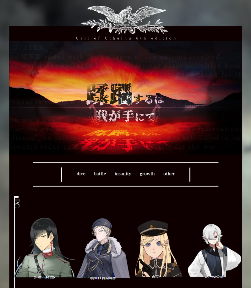 spmc_2☆quiet followDOODLECoC「蹂躙するは我が手にて」KP なのぴさんPC/PLHO1 ラーマー・シンゲル/ねぎさんHO2 リオート・ラスコーヴァ/オクラ丸さんHO3 白鷺環/音那さんHO4 ノア・ハングマン/しまエンド1 2生還2ロスト show all(+2 images) Tap to full screen (size:807x926).Repost is prohibited Let's send reactions! freqpopularsnackothersPayment processing Replies from the creator Follow creator you care about!☆quiet follow spmc_2DOODLECoC「FRaTRlCiDE-フラトリサイド-」KP オクラ丸さんPC/PLHO1 ルシエル・エヴァンダー・グリフィン/曄子HO2 ノア・バロン・アレクサンダー/ケイさんHO3 ジュード・ロバート・トゥルーマン/うりおかさんHO4 リアム・ローワン・トゥルーマン/しまエンド1 spmc_2DOODLECoC「3回ファンブルしたら死ぬ部屋」KPC/KP福来 鯨(ふくらい くじら)/迂路田ヨタロウさんPC/PL育田 雅人(いくた まさと)/時任さん零泉 茉利(れいぜん まつり)/しま鏡洲 朔弥(かがみず さくや)/香月羽さん全生還 spmc_2DOODLECoC「青白い馬」KPC/KP 有賀 侭/遊田さんPC/PL 柳葉 雪/しま生還 spmc_2DOODLECoC「俺があいつでこいつが犬で!?」KP ねこまるさんPC/PL育田 雅人(いくた まさと)/しま零泉 茉利(れいぜん まつり)/香月羽さん鏡洲 朔弥(かがみず さくや)/迂路田ヨタロウさん福来 鯨(ふくらい くじら)/時任さん spmc_2DOODLECoC「塔葬の国」KP いちくまさんPC/PL逢見 康治/オクラ丸さん陸鹿七 楽/ケイさん轟 輝輔/しま spmc_2DOODLECoC「火点し頃の蜘蛛踊り」KP ケイさんPC/PLPC1 釣木澤 萓/しまPC2 木村 十萌/遊田さんPC3 七海 皇我/曄子PC4 真室川 蜂耶/うりおかさん全生還