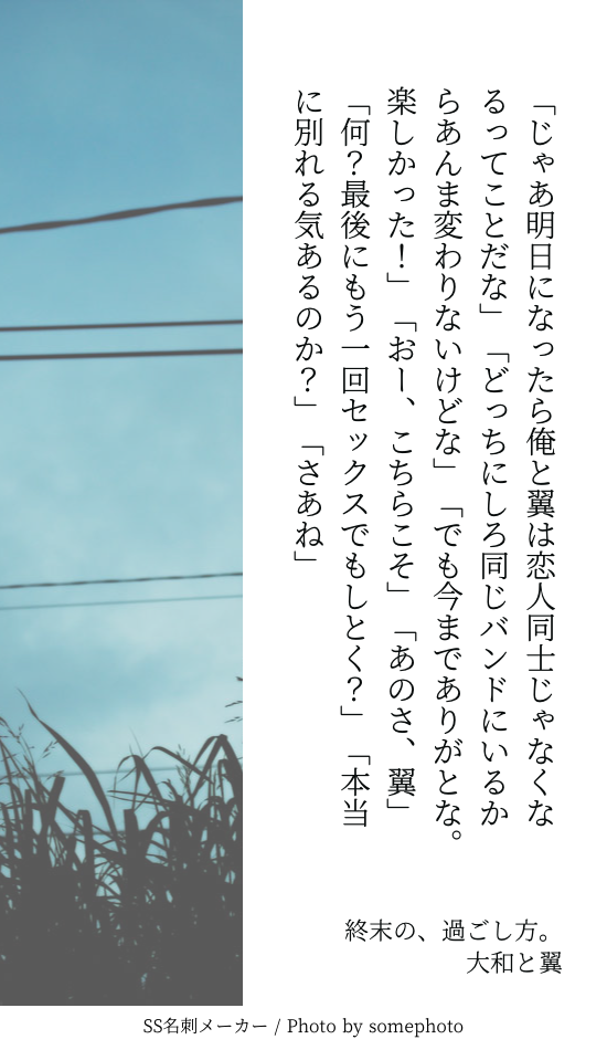 さいか☆quiet followMOURNING貴方はやまつばで『終末の、過ごし方。』をお題にして140文字SSを書いてください。 Tap to full screen (size:550x950).Repost is prohibited Let's send reactions! freqpopularsnackothersPayment processing Replies from the creator Follow creator you care about!☆quiet follow さいかMOURNING貴方はモモとユキで【 ××× 】をお題にして140字SSを書いてください。という感じに診断メーカーにもらったお題でリヴァライロスと戦ってきた記録です。お題提供元:https://shindanmaker.com/787893 7 さいかMOURNING斗真とルシカ/斗真と京極早く配信観た〜い 1125 さいかMAIKING「指の間から君を見ていた。」という文で書き出し、途中、視線を落として「さようなら」と言う大和と翼のお話。#shindanmaker #二人のお話https://shindanmaker.com/991414 382 さいかMOURNING140字SS 5 さいかMOURNING翼と宗介/10年後 680 さいかMOURNINGあなたはやまつばで【逃さない / むちゃくちゃに甘いのください】をお題にして140字SSを書いてください。 https://shindanmaker.com/780366 2 recommended works SirahaeDOODLE #プロセカ#初音ミク某所で描いたニーゴミクさん ten/天DONEえむちゃん 2 やこたきDONE描き初めは冬こはにしてみた るごDONE1日1絵 41~50日目 11 三日月くんDOODLE #プロセカ #ニーゴ #宵崎奏 #ボカロ #初音ミク #落書き 2 arincoDOODLE新彰らくがき「パフェが美味しいお気に入りのカフェがあるんだけどそこパンケーキもすごく美味しいんだよね、一緒に行かない?って言われたらなんだかんだで着いて行きそう☺️ ーーーDOODLE wankoro_artMOURNINGちびキャラ描けるようになりたい 2 名無しMAIKINGフェスいっちゃん途中
