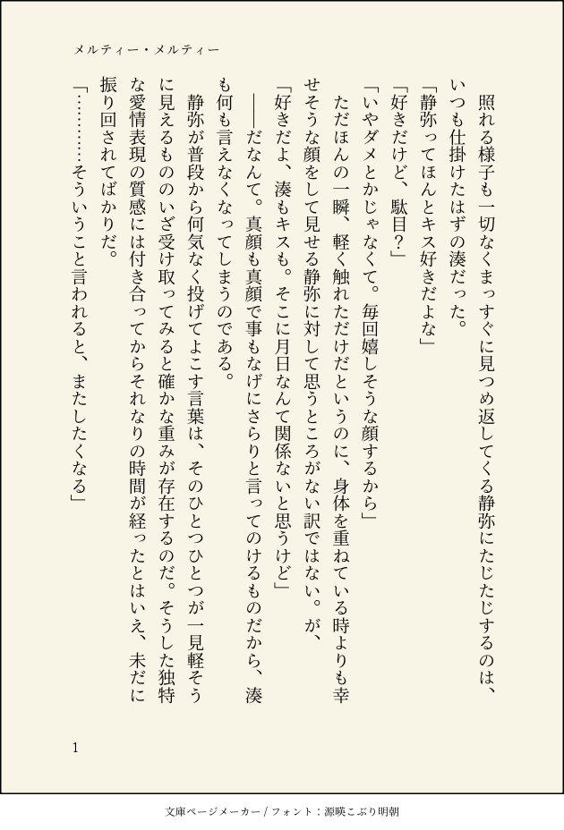しゆき☆quiet followMOURNINGいい冒頭全く思いつかなかったので供養。みなせ〜書いてます 書いてます show all(+1 images) Tap to full screen (size:630x928).Repost is prohibited Let's send reactions! freqpopularsnackothersPayment processing Replies from the creator Follow creator you care about!☆quiet follow しゆきPAST【湊静Web再録】あすの行方は既刊短編集『風が導く、あすの行方は』収録作品。2025.05.03スパコミ 無配『あすの在り処』の前日譚となります。 16 しゆきMOURNINGいい冒頭全く思いつかなかったので供養。みなせ〜書いてます 書いてます 2 しゆきDONE【春コミ無配/湊静SS】黄昏オレンジ折本として配布しておりましたSSです🍊 4 しゆきDONE自覚 2/湊静自覚 1の静弥視点です。私はめんどくさい静弥が好きだぞ!!!! 3 しゆきPASTテスト投稿用/湊×静弥心と震え、空に響け ワンライ企画6/2 自由題 443 recommended works HdogyiiiDOODLE全自动掐脖装置 ⚠こかぶDOODLE xxx_osktDONE甚時(非常勤講師×補助監督IF) 936 PepperDOODLE 2 mizushima_lpSPOILER銀魂展!!!の入口パスは1046 2 nm_041DOODLE※野菜で遊ぶ🦇 snn__3PROGRESSウィーウィッシュア! おさかなア〜モンドCAN’T MAKE花流 いい感じの雰囲気に耐えきれず思わず頭突きする🌸 graphitemmcDOODLE何のネタバレもない他陣さんイメージ※一部フリー素材お借りしています