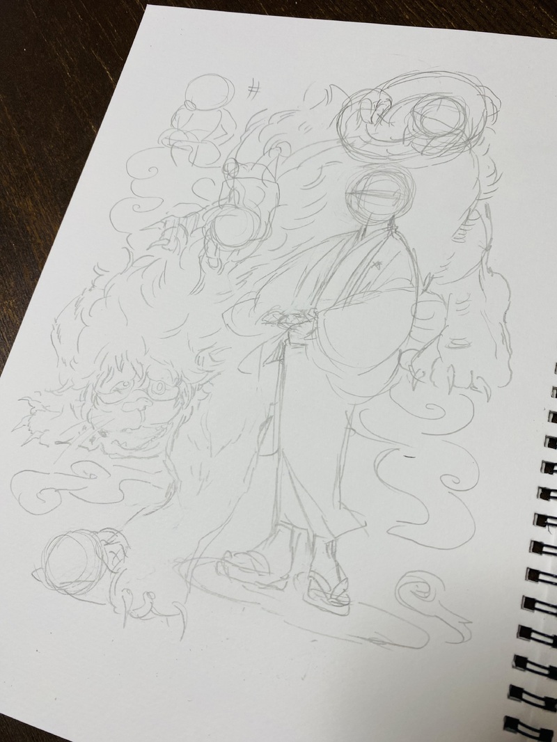 鵼も残り100頁ちょいになってきたので万感の思いで読了記念絵(予定)のラフを描いてる