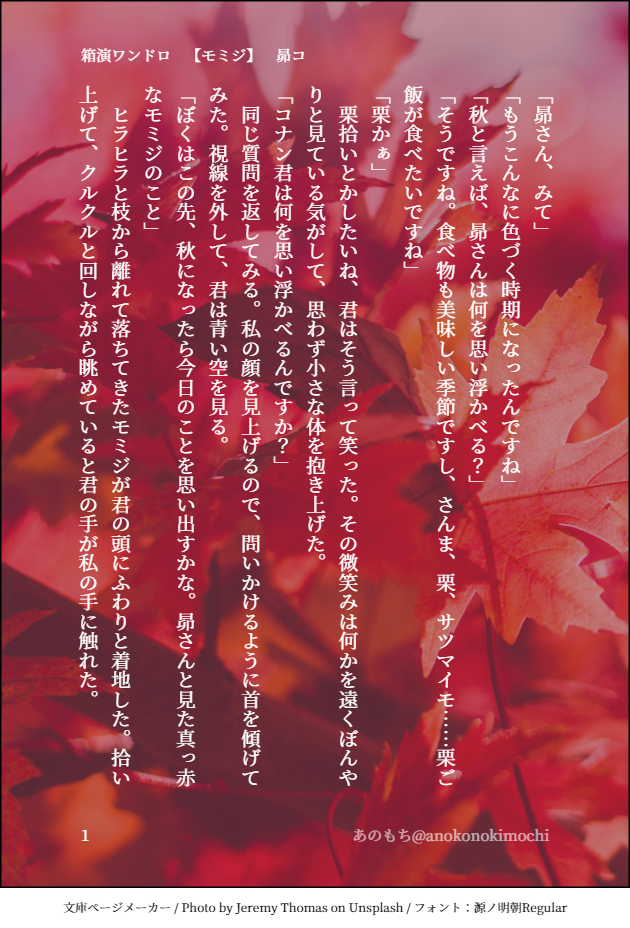 anokonokimochi☆quiet followDONEワンドロweek10/03お題【モミジ】昴コ show all(+1 images) Tap to full screen (size:630x928).Repost is prohibited Let's send reactions! freqpopularsnackothersPayment processing Replies from the creator Follow creator you care about!☆quiet follow anokonokimochiDONEバーボンが本気でコナンの誕生日をお祝いした話(タイトル)20220504開催 星降る5の夜の部で配布した無配です。出した本があまりにもお誕生日向けではなかったので(笑)本気でお祝いしてもらいました! 5220 anokonokimochiDONE星降る5 夜の部展示Twitterで『ギリギリの時間に新一を迎えにきたのは?』ていうアンケを4時間前くらいにして、結果が降谷零でした!迎えじゃなく、会いに来るに変更しましたがどうやらギリギリ間に合ったようです(笑)公開を誰でも読めるようにしました! 1030 anokonokimochiPROGRESS風見さんと一緒!3の原稿ごじゅうご:ここ二しかない場所0201~04で完結安室さんがある事件の犯人グループを追跡中にやられてしまって安室透だけを忘れてしまうお話時系列は観覧車の告白後なので好き同士なのは確認済の安コ 1432 anokonokimochiPROGRESS風見さんと一緒!進捗ろくじゅう:君は幸せになれまだ遠い、未来の話映画の予告でテンション上がったまま風見に幸せになってほしいと願う私の思いを上司に預けました。 2513 anokonokimochiPROGRESS風見さんと一緒!3の原稿だいぶん進んで現在59です風見には私の食べ方をしてもらってますコーヒーのミルクは二つで砂糖は一本ラーメンは醤油派のネギとメンマは増し増しでちなみにもやしの入っているラーメンは私は好きじゃないけど風見は野菜たっぷりのラーメン好きそう 1490 anokonokimochiPROGRESS風見さんと一緒!3の原稿ごじゅうご:ここ二しかない場所01~04で完結安室さんがある事件の犯人グループを追跡中にやられてしまって安室透だけを忘れてしまうお話時系列は観覧車の告白後なので好き同士なのは確認済の安コ 1343 recommended works TàngDOODLEslogan viết thường, viết liền, không dấu 鬼束仁(オニ)DONEオリキャラ白鬼と桃元(とおげん)SNSで見かける「〇〇しないと出られない部屋」を描いてみました かつどんDONE猫の日2025 2 はるかぜゆえTRAINING2024/07/23 はるかぜゆえTRAINING2024/08/25 trpgsuki1717DOODLE青白い馬げんみ❌ネタバレあり 2 C0LejiSPOILER烏が群れては、極彩色現行未通過✖️通過後見てねコレはHO3、秋玄の差分集です。サムネはふざけたファンブル差分 9 kome_bread029PAST【こげふわ展示】2023年に描いたおはなしのweb再録です。(※ネファです) 13 あくろ@AKCLO1DONE20250222羊と猫のワルツ9参加作品am02:50更新/ レノファウ 新作マンガ・イラストなど10枚。ワンドロライ参加作品もはいってますスタンプいただけたらうれしいです!波箱:https://wavebox.me/wave/6qrz71uhj74oovm1/ 10