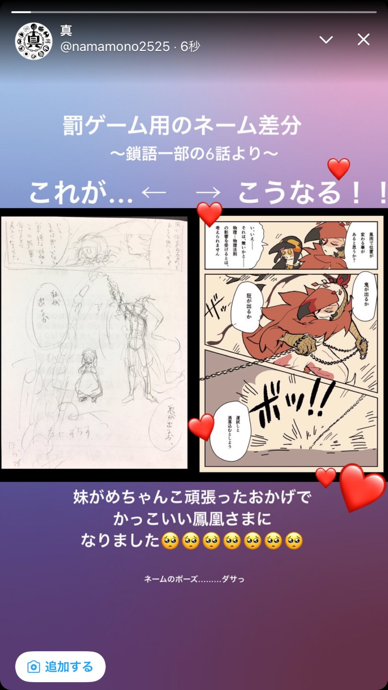 namamono2525☆quiet followPASTネーム差分〜鎖語一部6話より〜 Tap to full screen (size:1242x2208).Repost is prohibited Let's send reactions! freqpopularsnackothersPayment processing Replies from the creator Follow creator you care about!☆quiet follow namamono2525MOURNINGRPGゲーム用に書き下ろした「とがめ」主人公のプロットです。提供サイトのサービス終了をうけて、供養のためUP。ゲーム上演出を前提としていたり、選択肢があったりと読みにくいですが、気になる方はどうぞ。 36560 namamono2525REHABILI真庭十二支でバレンタイン総選挙🍡じかんがないって泣きついたら、妹がペン入れしてくれたぜ!きゃわゎ〜♡(о´∀`о)(※まにわには概念神で、里は天界にあるよ) 15 namamono2525PAST罰ゲーム!断罪円の錆となれ〜!ワハハハ!! namamono2525PAST罰ゲーム…二部より〜❤️妹のかく動物は生き生きしてるの〜!💕🙏💕 namamono2525PAST罰ゲームのネーム差分です!合いの手は妹オリジナルでした!ナイスフォロー👍✨ namamono2525PAST罰ゲームの人鳥砲🐧🐧🐧🐧