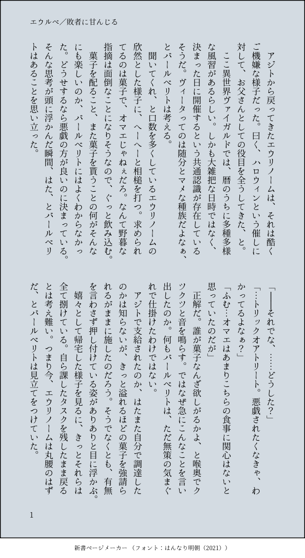 いモたふ☆silencio seguirPASADOエウルベ/ハロウィンの話 mostrar todo(+2 imágenes) Toque para pantalla completa (tamaño:618x1132).Está prohibido volver a publicar ¡Mandemos reacciones! frecuenciapopularbocadillootrosProcesando pago Respuestas del creador ¡Sigue al creador que te importa!☆silencio seguir いモたふPASADO現パロ、エウとバルベ(バナルマの姿)の話カス嘘〜🍉編〜倉庫に入れ忘れていたね 3 いモたふPASADO現パロサタブフ/読み聞かせの話 4 いモたふPASADO現パロサタブフ/寝つきが良い話 3 いモたふPASADOサタブフ/薔薇を食む話 3 いモたふPASADOサタブフ/イイところで邪魔が入る話 4 いモたふPASADOサタブフ/抱き枕の話と、オマケの後日談 7 obras recomendadas 艾萨初恋主页HECHONo.12《天使的伤痕》 32 いぬじんHECHO黒龍に乾杯2023で展示していた作品でした※出したい人を出してるので軸がブレブレです。辻褄が合わない事だらけなのでフワッと読んでください。 9 nemusou_souLUTO⚠︎赤面/ぐるぐる目貢がれようよYAGAMIさん 3 SHRGARABATEAR다이유키 2 Reelin(りーりん)GARABATEARfraux san coloredstone001MEMORÁNDUM雪花胶囊-第二章-得不偿失 10791 岸川珪花CAPACITACIÓN街角と、断崖にある家など(2025/01/16) 2 Tu28088BeiGARABATEAR工口 マヨ巽 2 みなとHECHO📣、📍、🚀、🧯、⚔️ 5