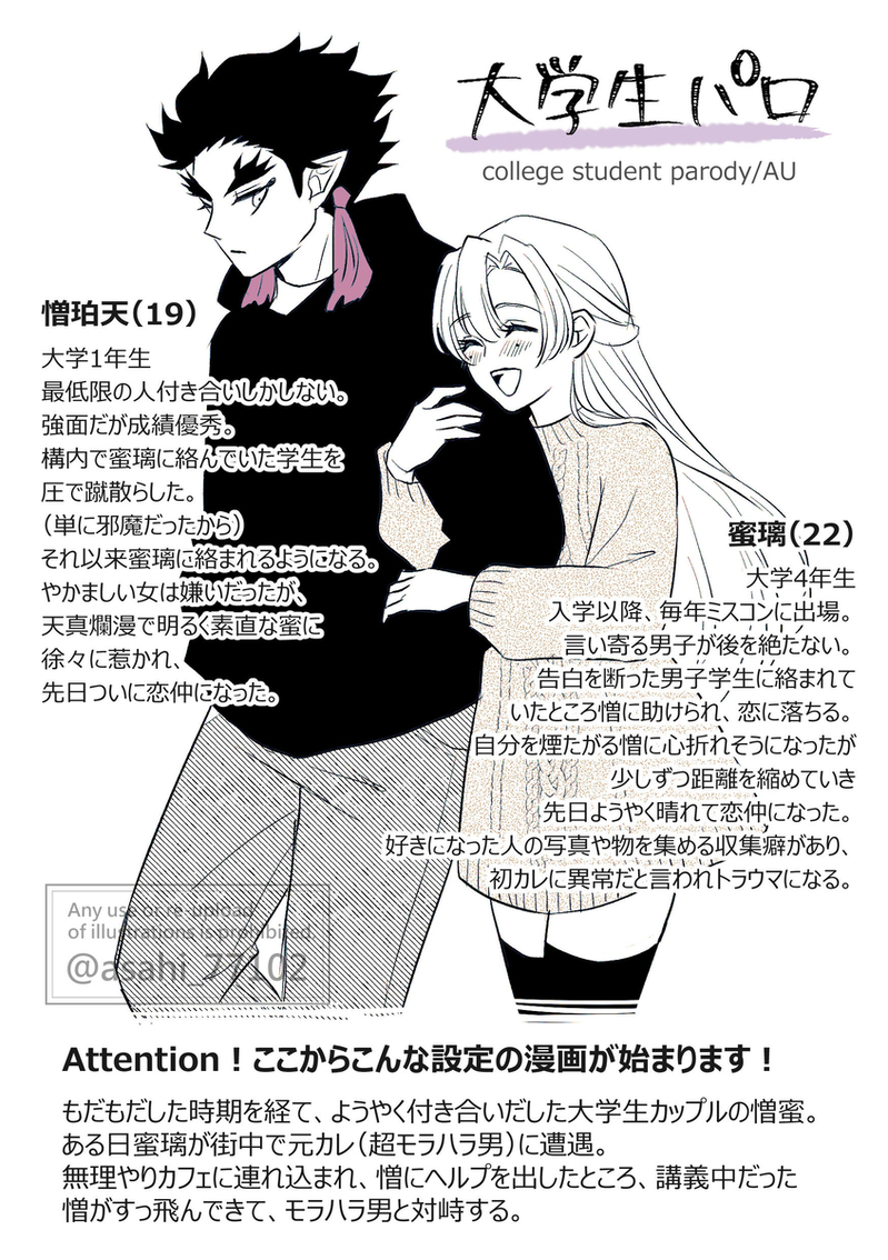 asahi☆こそフォロ過去のを晒す【憎蜜】現パロ 大学生憎蜜以下、少し特殊な設定です。・ようやく付き合った大学生憎蜜(not幼なじみ)・🍡には好きな人の写真や仕様物を集める癖があります。・🍡の元カレ(超絶モラハラ男)出てきます。【あらすじ】もだもだした時期を経てようやく付き合いだした大学生憎蜜。ある日蜜璃が街中で元カレに遭遇。憎にヘルプを出したところ、憎がすっ飛んできてモラハラ男と対峙する。 すべて表示(+3枚) タップで全画面(原寸:846x1200)無断転載禁止 リアクションをたくさん送って応援しよう! よく使う人気おやつその他支払処理中 作者からのリプライ 気になる人をどんどんフォローしよう!☆こそフォロ asahiできた【新作漫画】憎蜜 転生+幼なじみif原作軸から転生後、前世記憶アリの憎と、記憶ナシの蜜璃が出会うお話(全年齢)本文6ページ+おまけイラスト幼なじみの設定資料イラストはこちらhttps://poipiku.com/8567722/9226684.html 7 asahi過去のを晒す【憎蜜漫画 短編まとめ】1ページ漫画やイラストまとめです。現パロ、ジブリパロなど、ごちゃまぜ。 4 asahi過去のを晒す【憎蜜】現パロ 大学生憎蜜以下、少し特殊な設定です。・ようやく付き合った大学生憎蜜(not幼なじみ)・🍡には好きな人の写真や仕様物を集める癖があります。・🍡の元カレ(超絶モラハラ男)出てきます。【あらすじ】もだもだした時期を経てようやく付き合いだした大学生憎蜜。ある日蜜璃が街中で元カレに遭遇。憎にヘルプを出したところ、憎がすっ飛んできてモラハラ男と対峙する。 4 asahiできた【舞台感想イラスト 憎恋バージョン】舞台 刀鍛冶の里編の感想、憎恋まとめです。全3ページの予定ですが、現在2ページまで掲載しています。間に合わずすみません…!3ページ目は後日Xにまとめて掲載予定です。全ては緊縛憎が描きたくてこれを描き始めました。ほんと凄かった…。来月円盤が来るの楽しみすぎる! 2 asahiできた【憎恋+他キャラ】鬼殺隊士パロ 設定画鬼殺隊士ifです。🍡は恋柱、憎は一般隊士で🍡の継子設定です。憎の育手は怯爺(若い頃は強く美丈夫でブイブイ言わせてた)で喜怒哀楽たちは兄弟子です。使う呼吸は皆きっとなんかスゴイ呼吸です。笑時間があれば、兄弟子の喜怒哀楽も描きたいです…期間中に間に合わなければ後日アップします。 2 asahi過去のを晒す舞台 刀鍛冶の里編 憎まとめ4月公演と配信を見ての感想です。憎メインです。憎恋まとめは現在制作中です。 3