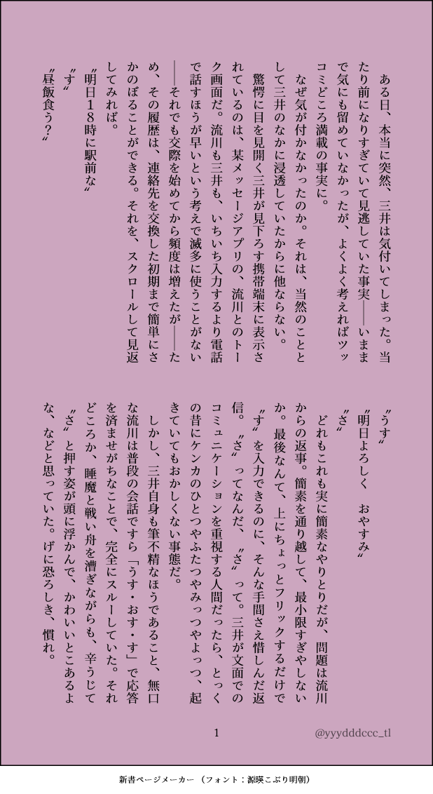 ゆだち☆quiet followDONE47. できてるふたり(高×大)のメッセージのやりとりの話※バカップルです※スマホが出ます show all(+3 images) Tap to full screen (size:618x1132).Repost is prohibited ゆだちDONE74.自然に手をつなぐ二人が見たーい!という話※66と同じ二人です※令和軸 1910 ゆだちDONE73.できてない二人のインスタの話※周りから「はよくっつけ」と思われている系の両片思い流三※スマホが出ます 5 ゆだちDONE72.雨をきっかけにちょっと距離が近付く、高1と高3のできてない二人の話おだいばこで頂いた「体育館から降る雨を眺めつつや、傘の下などの流三」を書かせていただきました。 6 ゆだちDONE71.できてない二人が、リョと桜の遊び心でくっついた話 2 ゆだちDONE70.PGをやった流が三を好きになっちゃった話の続き 5 ゆだちDONE69.できてるふたりの昔と今の🎂話 6 recommended works BeMelody1DOODLE刃x枫和恒密码18↑?(y/n) 2 ゆめこぼしDONE孤月さんに弱点触られてぐずぐずの🍵坎♀ちゃん 2 mochencccDOODLE人鱼解剖性研究 4 かみおMOURNING溶けて消える 549 Ichi0421ButterDOODLEPass ソフラン大量の23公募のコンボ数 1005 かさのゴミ箱MOURNINGボスキが主様の後を追う話(めちゃくちゃ自分用 984 優夢🐬🐬DOODLEFA アイビスペイント 永世を生きる君へ真実を ナイトメア様より凛音ちゃんと零様 「いつか来る、未来の姿」自己解釈含みます。ナイトメア様に届け!! なこ🎮TRAININGハーフアップ軽歩練習かきながら観察してたらハーフアップの破壊力に気付いてしまった、かわいい 葡萄汽水甜年年DONE迟到的圣诞节贺文。g向描写有真的是搞笑日常向! 4739