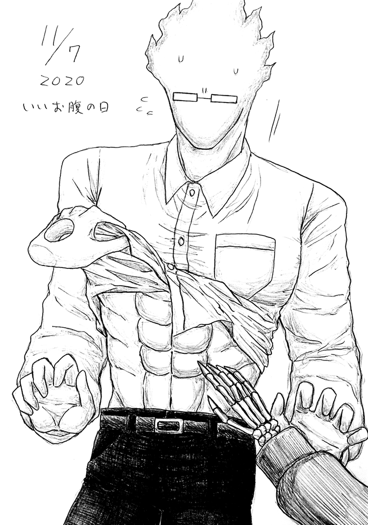 いいお腹の日のサングリとガスグリ💀🔥👻(sansby & grillster)Yシャツを捲ってグリルビーさんの腹筋を触ろうとするサンズとガスター博士