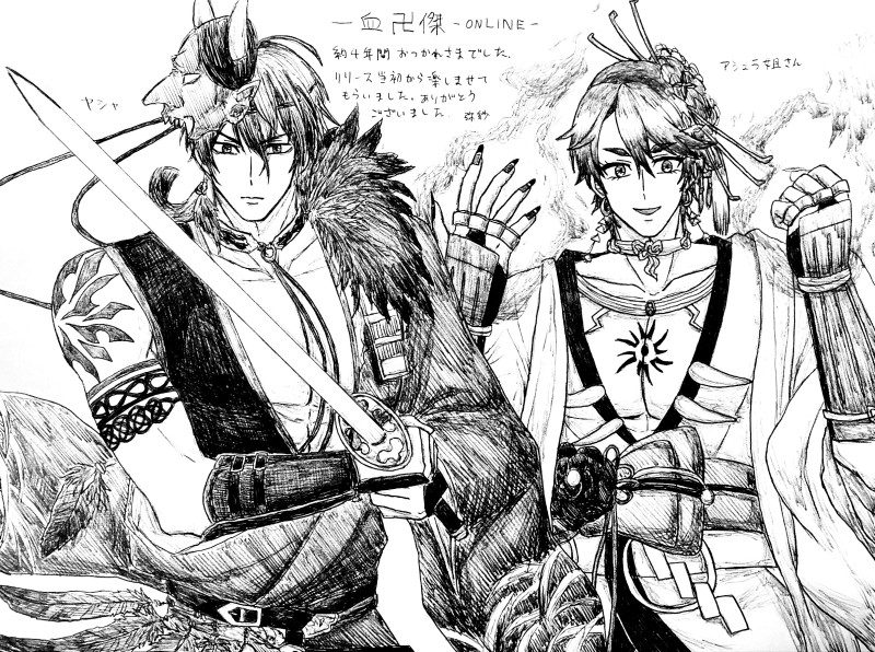 約4年間お疲れ様でした。リリース当初から遊ばせてもらいましたがとても楽しかったです。本当にありがとうございました。推しのヤシャとアシュラ姐さん(上限突破)を描きました