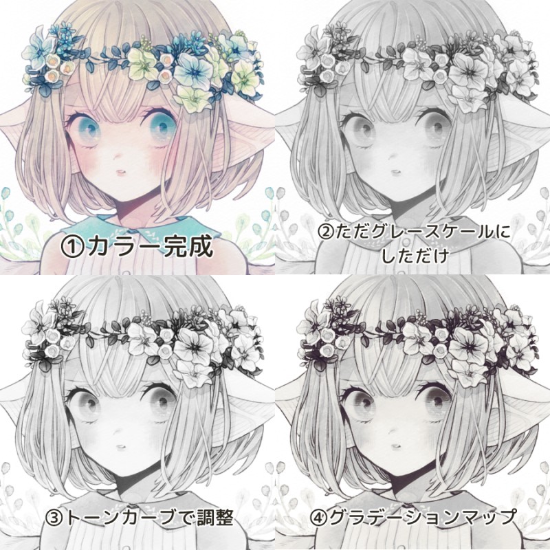 グレスケ→トーンカーブ→グラデーションマップの見比べ。