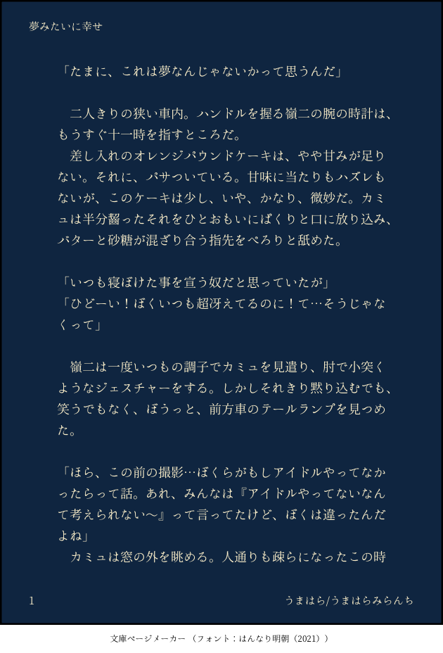 haramiLunch☆quiet followDOODLEWhite Gravityのカミュさんの歌詞が余りにも刺さって抜けないので書きました。尻切れトンボですみません… #キラキス kissingWithAKisser #AnotherWorld show all(+5 images) Tap to full screen (size:630x928).Repost is prohibited Let's send reactions! freqpopularsnackothersPayment processing Replies from the creator Follow creator you care about!☆quiet follow haramiLunchDONEボーイズといいつつ、へべれけなのは嶺二だけ。左右は決めていませんがカミュ嶺風味かも? 7 haramiLunchPASTシャニライのたぬがまだちびちゃんだった頃につけていた日記をイメージして書いてます。捏造しかない上に寿以外はモブしか出てこないのでご注意ください。 5 haramiLunchMENU2024/5/5開催の超プリ★コンにて頒布させていただく新刊の2~4話サンプルです。1話はpixivに全文サンプルがあります。Xの新刊についての注意書きもご確認ください。 6 haramiLunchDONEカミュさんと嶺二さんが何月に出会ったのかわからないのですが、出会った年のお誕生日の話だと思ってくださいスタバをモデルに書きましたが、スタバの新作飲まないのであんまり雰囲気合ってないかもしれません…カミュさん、お誕生日おめでとうございます。幸せも甘いものも欲張って、最高の人生を送ってください。 7 haramiLunchDOODLEキラキスのケーキ🎂アンケートにお付き合い頂きありがとうございました🙇♀️いろいろ(シャニライとの別れ)(映画告知)あって上げられていなかった小話2つを掲載させていただきますこれらを書いたあとに高…屋の件をテレビで見て、なんと間が悪いんだと思いましたがもう書き直す気力もないのでそのまま上げます…😇 4 haramiLunchDOODLEキラキスご無沙汰だったので書き散らしをサルベージしました。2人ともなんだかんだ仕事が好きで、頑張り屋さんなんだよなあと思っています 4 related works みつき💐🚿DONE💐Green Fingers ①1~4話 14 haramiLunchDONE2023/10/15 TOKYO FES Oct.内プリ☆コンにて無配したキラキスお花屋さんSSです。受け取ってくださった方ありがとうございました。trfのLove&Peace Foreverが、配達に向かう店長さんの車の中で流れていたらいいなあと思って書きました。普段のカミュさんはとても大人びた素敵な人ですが、年相応に成長途中のカミュくんもまた魅力的なキャラクターだなと思っています。 5 シオリDOODLEキラキスASSHCのグループ紹介の並び(スマホ版)でもうちょっと寄らせたかった Hana_41_DONE【再掲】「我慢」p1661kgの嶺二が短期間で64→54kgになっちゃった話p13からR18 4 haramiLunchDOODLEキラキスご無沙汰だったので書き散らしをサルベージしました。2人ともなんだかんだ仕事が好きで、頑張り屋さんなんだよなあと思っています 4 Hana_41_DONE「choice」再掲。#キラキス #カミュ嶺 #R18 22 Hana_41_DONE【R18】type sweet「𝐂𝐋𝐎𝐒𝐄」相手の身体の1番柔らかい場所を触らなければ出られない部屋。まずは甘々なカミュ嶺。全p11。 11 haramiLunchDOODLE嶺二さんは誰よりも悪魔っぽいのに、悪魔には向いてなさそうだなって思いました。そしてカミュさんが、役に飲まれるほどヤワではないわと心の中で笑うので、強いカミュさんを書きました。言うだけタダの今のうちにしか書けない(多分…) 5 haramiLunchDONEカミュさんと嶺二さんが何月に出会ったのかわからないのですが、出会った年のお誕生日の話だと思ってくださいスタバをモデルに書きましたが、スタバの新作飲まないのであんまり雰囲気合ってないかもしれません…カミュさん、お誕生日おめでとうございます。幸せも甘いものも欲張って、最高の人生を送ってください。 7