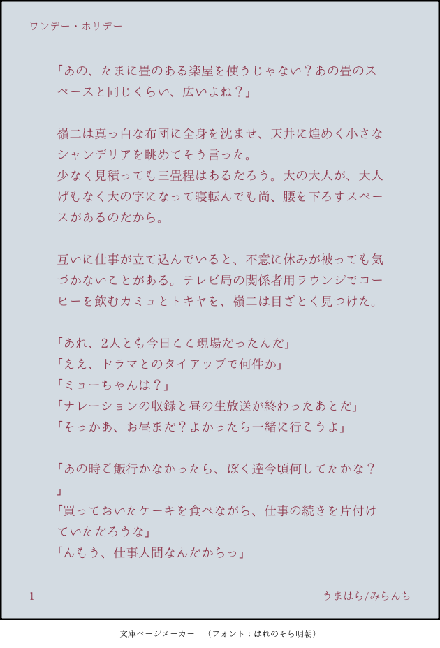 haramiLunch☆quiet followDOODLEキラキスご無沙汰だったので書き散らしをサルベージしました。2人ともなんだかんだ仕事が好きで、頑張り屋さんなんだよなあと思っています #キラキス kissingWithAKisser show all(+3 images) Tap to full screen (size:630x928).Repost is prohibited Let's send reactions! freqpopularsnackothersPayment processing Replies from the creator Follow creator you care about!☆quiet follow haramiLunchDONEボーイズといいつつ、へべれけなのは嶺二だけ。左右は決めていませんがカミュ嶺風味かも? 7 haramiLunchPASTシャニライのたぬがまだちびちゃんだった頃につけていた日記をイメージして書いてます。捏造しかない上に寿以外はモブしか出てこないのでご注意ください。 5 haramiLunchMENU2024/5/5開催の超プリ★コンにて頒布させていただく新刊の2~4話サンプルです。1話はpixivに全文サンプルがあります。Xの新刊についての注意書きもご確認ください。 6 haramiLunchDONEカミュさんと嶺二さんが何月に出会ったのかわからないのですが、出会った年のお誕生日の話だと思ってくださいスタバをモデルに書きましたが、スタバの新作飲まないのであんまり雰囲気合ってないかもしれません…カミュさん、お誕生日おめでとうございます。幸せも甘いものも欲張って、最高の人生を送ってください。 7 haramiLunchDOODLEキラキスのケーキ🎂アンケートにお付き合い頂きありがとうございました🙇♀️いろいろ(シャニライとの別れ)(映画告知)あって上げられていなかった小話2つを掲載させていただきますこれらを書いたあとに高…屋の件をテレビで見て、なんと間が悪いんだと思いましたがもう書き直す気力もないのでそのまま上げます…😇 4 haramiLunchDOODLEキラキスご無沙汰だったので書き散らしをサルベージしました。2人ともなんだかんだ仕事が好きで、頑張り屋さんなんだよなあと思っています 4 related works みつき💐🚿DONE💐Green Fingers ①1~4話 14 haramiLunchDONEカミュさんと嶺二さんが何月に出会ったのかわからないのですが、出会った年のお誕生日の話だと思ってくださいスタバをモデルに書きましたが、スタバの新作飲まないのであんまり雰囲気合ってないかもしれません…カミュさん、お誕生日おめでとうございます。幸せも甘いものも欲張って、最高の人生を送ってください。 7 haramiLunchDOODLEキラキスご無沙汰だったので書き散らしをサルベージしました。2人ともなんだかんだ仕事が好きで、頑張り屋さんなんだよなあと思っています 4 Hana_41_DONE【R18】type sweet「𝐂𝐋𝐎𝐒𝐄」相手の身体の1番柔らかい場所を触らなければ出られない部屋。まずは甘々なカミュ嶺。全p11。 11 haramiLunchDONE2023/10/15 TOKYO FES Oct.内プリ☆コンにて無配したキラキスお花屋さんSSです。受け取ってくださった方ありがとうございました。trfのLove&Peace Foreverが、配達に向かう店長さんの車の中で流れていたらいいなあと思って書きました。普段のカミュさんはとても大人びた素敵な人ですが、年相応に成長途中のカミュくんもまた魅力的なキャラクターだなと思っています。 5 シオリDOODLEキラキスASSHCのグループ紹介の並び(スマホ版)でもうちょっと寄らせたかった Hana_41_DONE「choice」再掲。#キラキス #カミュ嶺 #R18 22 haramiLunchDOODLE嶺二さんは誰よりも悪魔っぽいのに、悪魔には向いてなさそうだなって思いました。そしてカミュさんが、役に飲まれるほどヤワではないわと心の中で笑うので、強いカミュさんを書きました。言うだけタダの今のうちにしか書けない(多分…) 5 Hana_41_DONE【再掲】「我慢」p1661kgの嶺二が短期間で64→54kgになっちゃった話p13からR18 4 recommended works いそらTRAINING きゅんDONEハロウィン衣装が好き過ぎた イスティナDOODLEイレブン、カミュ、セーニャの落描き 2 うにDOODLE彼のファン続けてかれこれ7年 PrzmStarMEMO_φ(・_・デザイン苦手… PrzmStarDOODLEリハビリカミュさん♒️ちょっと意味深風… PrzmStarDOODLEFreeze Your Mouth普通?のミロカミュ♏️♒️普通にかっこよく共闘してるのも勿論好きですね。余裕ありすぎて軽口で猥談するのは更にいとおかし PrzmStarDOODLEkさん体調不良との事で、和菓子の折詰出しときますね♒️お大事に〜💦 PrzmStarDOODLEおちごと前の手慣らし一発描き、おしょたなミロカミュ♏️♒️幼馴染で親友っていーよね( ˇωˇ )✨✨
