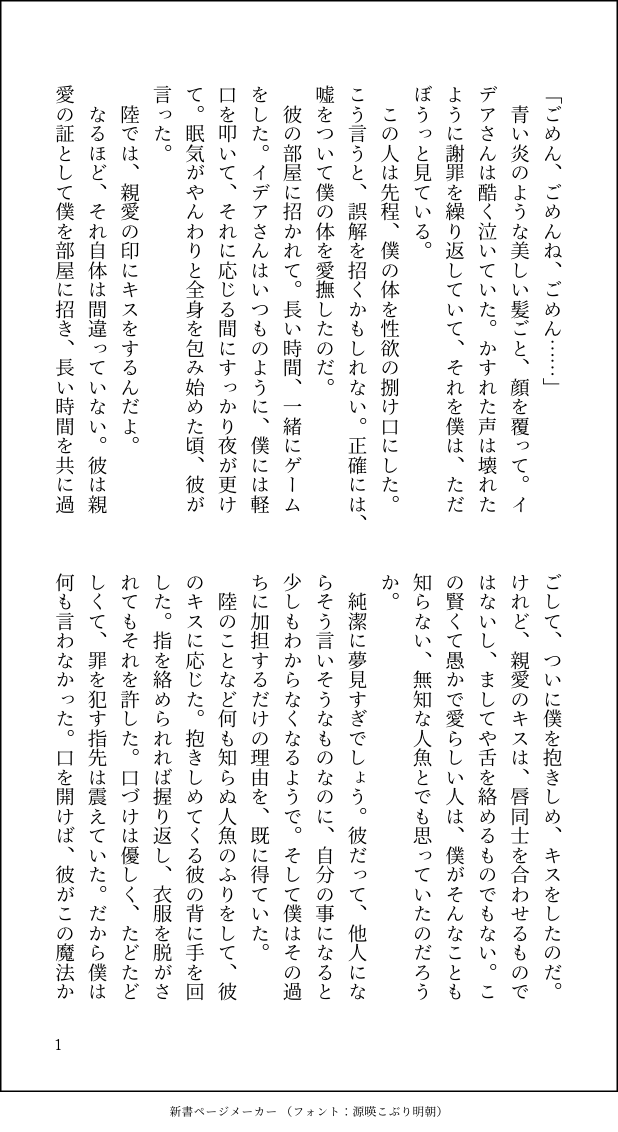 岩藤美流☆quiet followDONE歌詞から解釈するシリーズです。体を売ったのは、あずのほう ##アズイデ短編 show all(+2 images) Tap to full screen (size:618x1132).Repost is prohibited Let's send reactions! freqpopularsnackothersPayment processing Replies from the creator Follow creator you care about!☆quiet follow 岩藤美流DONE現パロ、ルオが性に奔放すぎるバンドパロ 7754 岩藤美流DONE続きはありそうな感じだけどまだ全く書いてないです 9382 岩藤美流DONEを、書こうとしたけど実際は気持ち良すぎるのをやめてほしかったウィルルオ。本番から書いて前半を書き足したから、文体が違ってちょっとおもろい。 6889 岩藤美流DONE両片想いで、ルオが性に対して大らかすぎて不特定多数の男に抱かれている世界線のウィルルオです。仮タイトルは「モヤモヤ」でした。 8093 岩藤美流DONE今しか書けないから書いた10周年第1章、ナス君どうなるんだよ記念のらぶらぶえちちだけの短いお話です。もしナス君が堕ちたらこの後「ル・オーの望まない行為を無理矢理するし痛い」っていう対比に繋がるってワケ 5346 岩藤美流DONEただイチャイチャしてるだけでござる 3029 recommended works れんこんDONE第二回ベスティ♡ワンライ用フェイビリ/ビリフェイお題「HELIOS∞CHANNEL」 2313 TariDONE宇煉のワンライに参加した小説です!お題は「ジューンブライド」。「ヴァージン・ブリーズ」の続編ですが、これ単体でも読めます。 2142 さくともDONEお題:「なにを見てるの」#帝幻版深夜の創作一本勝負🎲を振り回す📚を書きたかったのですが、最終的に頭を空っぽにして読んでほしい文章になりました(謝罪) 3 MT24429411DONEラーヒュンワンライ「熱帯夜」 1703 MT24429411DONEラーヒュンワンライ「手指」 2827 ao_lakeDONE半ロナワンライ「窓」ロナルド君の事務所の窓の修理に来たモブ業者がうっかりちゅーしてる半ロナを見てしまう話 1587 ao_lakeDONE半田とデートしたい高校1年生のロナルドとヒヨシのとても短い話。お題「春」と「続く」 869 ouse_kaedenDONEリク×ガチャ×ワンドロ……の筈が二時間近くなっちゃいました( ・ω・)ゞ大包平と親子。なんかほのぼのホラー 2065 えんがわ(ともる)DONE #創作BL版深夜の60分一本勝負闘病を経て約2年ぶりの参加となりますm(_ _)m小説メインのBL創作者です🍣🍵ポイピクにお題を投稿させて頂きました_φ(・_・*)♡※R-15刑事モノ/受け攻め共に異なる暴力(攻:家庭内DV/受:拉致監禁事件)の被害者という設定/16歳になっていない方は読まないで下さいね? 1107