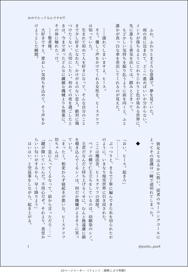 panko_pan8☆quiet followDONEヒス晶︎︎ ♀ / おめでたって何ですか!?第2回ヒス晶webオンリー 「想いをオルゴールの調べにのせて2」での展示小説です。シノから賢者様が「おめでた」だと聞いて、大騒ぎになるヒースの話。ドタバタラブコメディです! show all(+10 images) Tap to full screen (size:888x1300).Repost is prohibited Let's send reactions! freqpopularsnackothersPayment processing Replies from the creator Follow creator you care about!☆quiet follow panko_pan8DONEヒス晶︎︎ ♀ / おめでたって何ですか!?第2回ヒス晶webオンリー 「想いをオルゴールの調べにのせて2」での展示小説です。シノから賢者様が「おめでた」だと聞いて、大騒ぎになるヒースの話。ドタバタラブコメディです! 11 recommended works と、、んは。ちSPOILER新刊「委員長がちっちゃくなっちゃった!」の割愛したシーンの下書きになります。あの時じつは先輩たちが気を使ってくれてたという所です。パスワードは出てきた鳥の名前をローマ字で。nはひとつで5文字です。 4 mizuDOODLE 3 ゆもやまDOODLE 2 DOMADOSPOILERVOID 現行未通過❌뱀의 해 🐍 4 marushu_twDONE寂雷先生お誕生日おめでとうございます!TDD解散直後くらいのまだくっついてない左寂 863 al_ramienDOODLE🦌と固定🌸さんとのベビーという気狂いの産物ベビーはダディの血を継いでるのでそこそこ魔法使える設定です鹿に変身できます 5 3mis5ooMOURNING祝装感想☔️ふせったに投げようと思ったのですがメンテなのでとりあえずこっちに【追記有】 3882 シン/今年もプロメア見れる嬉しいINFO2日目のペーパーを再録しました。実際のペーパーはB7サイズでした。https://xfolio.jp/portfolio/pispispis/works/3711450 雪風(ゆきかぜ)。DONE素材はこちらからお借りしました https://commons.nicovideo.jp/works/nc201651翠くんからのお誘い♡乗りたい。