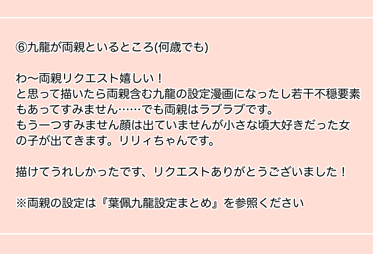 kyousuke0418☆quiet followDONE【黄昏刻に龍ぞ棲む4】エアスケブ 第三弾 #葉佩九龍 yipPuiKowloon show all(+10 images) Tap to full screen (size:768x524).Repost is prohibited Let's send reactions! freqpopularsnackothersPayment processing Replies from the creator Follow creator you care about!☆quiet follow kyousuke0418PAST主雛まとめ🍊実はいる亜柚子専用機九龍は8歳下だけど歳の差は全然気にしてないですというかむしろ亜柚子の方が色んな意味で若いと思ってるよく男に狙われるので九龍はセコムになりがち 5 kyousuke0418PAST九龍単品絵まとめ🐉 13 kyousuke0418PAST昔サマウォに激ハマりした時描いた『ラブマシーンの顔をつくる』漫画です。なに言ってんだコイツとなった人はこのまま閉じて忘れよう。たくさんの注意事項・アバターたちがそれぞれの自我を持って喋ります・ラブマはあの事件で消滅しておらずある日キングの前に現れてこっそり同棲しています・ラブマ→キング、佳主馬×健二の要素があります・ラブマの仮の顔が出ます⚠️本当になんでも許せる人向け⚠️ 4 kyousuke0418DONE【黄昏刻に龍ぞ棲む4】エアスケブ 第三弾 11 kyousuke0418DONE【黄昏刻に龍ぞ棲む4】エアスケブ 第二弾 11 kyousuke0418DONE【ジュヴナイル主機設定まとめ②】戦闘傾向と恋人は下記CPをベースにしています龍麻×京一九龍×マリヤ&皆守七代×雉明それ以降は恋人のいない3人の世界線ですこの関係性と設定が九龍×龍麻へ続いています 9 related works kyousuke0418DONE【ジュヴナイル主機設定まとめ】緋勇龍麻(魔人学園剣風帖)葉佩九龍(九龍妖魔學園紀)七代千馗(鴉乃杜學園奇譚)全員攻めで下記CPを前提にしています龍麻×京一九龍×マリヤ&皆守七代×雉明 14 satoDONE9th後。葉佩と阿門のゆる〜いコメディです。 2160 ひらみDONEデフォルメは描いても描いても描き慣れぬ るれんMEMO弊佩二名俺様佩、幼女佩の設定です 4 satoDONE8thネタ。七瀬、鎌治、トトと葉佩の小話。葉佩の誕生日が8thと同じ日だったらというif 2627 kyousuke0418DONE【黄昏刻に龍ぞ棲む4】エアスケブ 第三弾 11 あるやDOODLEトレハンプロフのプリクラ用に塗ったマイ葉佩!!何故か3枚目の下書きと顔変わってた(´-ω-)もっとスカしたツラしてたんだけどな〜(笑) 3 satoDONEジュヴFES2で展示していたSSです※3thの主+皆※名前を覚えるのが苦手な葉佩と皆守の話 1550 satoDONEジュヴFES2で展示していたSSです6thの主+黒無配展示のお題「【怒】」をお借りしています 2859 recommended works ひらみDONEデフォルメは描いても描いても描き慣れぬ kyousuke0418DONE【ジュヴナイル主機設定まとめ】緋勇龍麻(魔人学園剣風帖)葉佩九龍(九龍妖魔學園紀)七代千馗(鴉乃杜學園奇譚)全員攻めで下記CPを前提にしています龍麻×京一九龍×マリヤ&皆守七代×雉明 14 baseb11panDOODLEぃのみゃさんの天才にょたフジミhttps://x.com/3sanhachi8/status/1818967332536066451?s=46 2 mochencccDOODLE姜涵的史莱姆研究 3 chinoto-100MEMO自分用、クリスマスイラストのボツラフ来年とか再来年とか他の行事のネタに使いたい 2 ---MOURNING他ジャンルですが手が回らないのでここにそっと供養。細胞。死ネタです。 9 s_🍵MEMO🎄葉月の序盤だけ/別々の大学設定 1354 1tian01knightDOODLE高天亮(tian)x卓定(knight)全文约2w,几乎纯肉,he。预警:r20,包括但不限于bdsm、sp、滴蜡、k9、边缘控制、视觉语言剥夺、言语暴力等。 没有永久性伤害。*食用口感为甜-辣-苦/酸-甜*包含一些个人理解的、可能引起ptsd的22tes时期扭曲的感情*有Drop期与aftercare描写,部分内容非常酸涩以上虽然啰嗦,但请务必确保在以上都可以接受的情况下再继续 9576 おぼれDOODLE数分後体外式ポルチオぐりぐり📱に至る_______ 4
