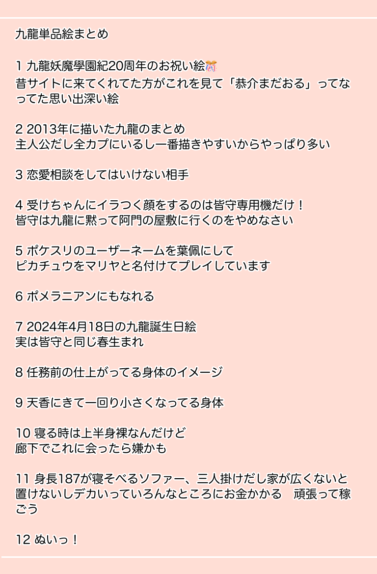 kyousuke0418☆quiet followPAST九龍単品絵まとめ🐉 #九龍妖魔學園紀 kowloonDemonAcademy #葉佩九龍 yipPuiKowloon show all(+12 images) Tap to full screen (size:768x1169).Repost is prohibited Let's send reactions! freqpopularsnackothersPayment processing Replies from the creator Follow creator you care about!☆quiet follow kyousuke0418PAST主雛まとめ🍊実はいる亜柚子専用機九龍は8歳下だけど歳の差は全然気にしてないですというかむしろ亜柚子の方が色んな意味で若いと思ってるよく男に狙われるので九龍はセコムになりがち 5 kyousuke0418PAST九龍単品絵まとめ🐉 13 kyousuke0418PAST昔サマウォに激ハマりした時描いた『ラブマシーンの顔をつくる』漫画です。なに言ってんだコイツとなった人はこのまま閉じて忘れよう。たくさんの注意事項・アバターたちがそれぞれの自我を持って喋ります・ラブマはあの事件で消滅しておらずある日キングの前に現れてこっそり同棲しています・ラブマ→キング、佳主馬×健二の要素があります・ラブマの仮の顔が出ます⚠️本当になんでも許せる人向け⚠️ 4 kyousuke0418DONE【黄昏刻に龍ぞ棲む4】エアスケブ 第三弾 11 kyousuke0418DONE【黄昏刻に龍ぞ棲む4】エアスケブ 第二弾 11 kyousuke0418DONE【ジュヴナイル主機設定まとめ②】戦闘傾向と恋人は下記CPをベースにしています龍麻×京一九龍×マリヤ&皆守七代×雉明それ以降は恋人のいない3人の世界線ですこの関係性と設定が九龍×龍麻へ続いています 9 related works 高間晴DOODLEツイッターアイコン用皆守 kbDONE待ち遠しい yanyantad_DOODLEかわいいな夷澤ー「ねッセンパイ。」じゃないよもう 高間晴DOODLEうちの葉佩九龍イメージ みなかみ朝朱PASTコピック5色縛り絵の詰め込み。基本文ストですが、一枚だけ九龍です 5 すゆうDOODLE雑誌引きちぎれとるけどもうこれで……オンラインオンリーイベントがうれしいらくがき。 りゅう/龍DOODLEこの二人の共通点に気が付いてしまって、好きになる要素しかなかったんだと諦めました・・・足立透がーーーって言うか、足主がめっちゃ好きやwwもうあきらめて、自分と向き合いました(笑)んなわけで、もう自分で足立描くわ~ 2 Utsugidake_18DOODLE九龍Switchで復活おめでとう!ずっと待ってました! 高間晴DOODLEうちの葉佩九龍のお気に入り武器一覧 recommended works あるやDOODLEトレハンプロフのプリクラ用に塗ったマイ葉佩!!何故か3枚目の下書きと顔変わってた(´-ω-)もっとスカしたツラしてたんだけどな〜(笑) 3 ひらみDONEデフォルメは描いても描いても描き慣れぬ 手癌哒哒DOODLEaph 玫瑰花茶魅魔r 补档 14 kyousuke0418DONE【ジュヴナイル主機設定まとめ】緋勇龍麻(魔人学園剣風帖)葉佩九龍(九龍妖魔學園紀)七代千馗(鴉乃杜學園奇譚)全員攻めで下記CPを前提にしています龍麻×京一九龍×マリヤ&皆守七代×雉明 14 𝙢𝙪𝙜𝙞𝙘𝙝𝙞𝙮𝙤DOODLEえびおさん新衣装すごい mochencccDOODLE姜涵的史莱姆研究 3 おぼれTRAINING体外式ポルチオぐりぐり📱。🎈📱。 咲良猿化士DOODLE咲夜ちゃんSEX howdy_087DOODLEメリクリということでね