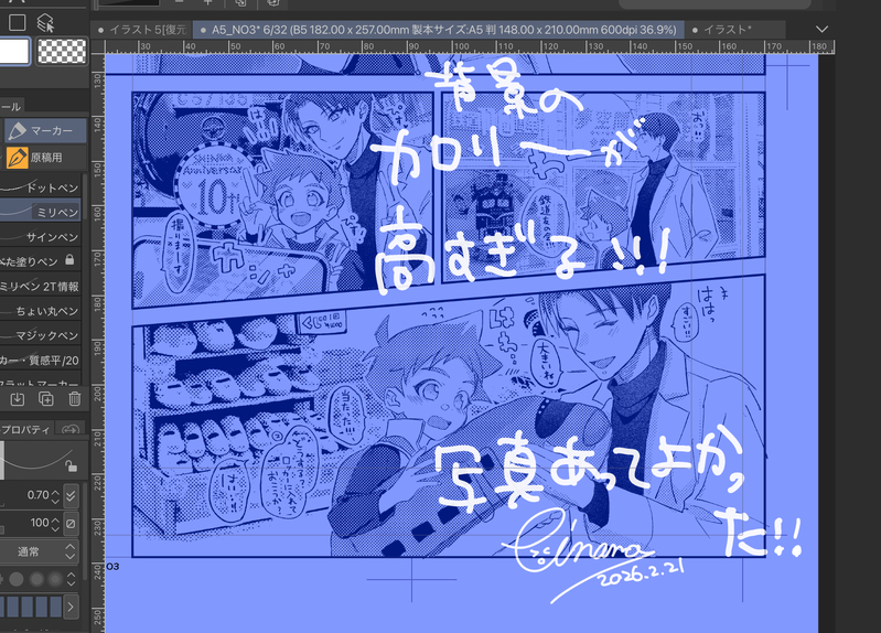 えい🚄なな☆こそフォロ作業進捗【スバハヤ】本の進捗…写真撮りに行って良かった…なかったら死んでた。ペン入れ終わってる分のトーンまで終わってしまいそうなのでそろそろペン入れに戻るか… タップで全画面(原寸:1720x1235)無断転載禁止 リアクションをたくさん送って応援しよう! よく使う人気おやつその他支払処理中 作者からのリプライ 気になる人をどんどんフォローしよう!☆こそフォロ えい🚄なな作業進捗【スバハヤ】本の進捗…写真撮りに行って良かった…なかったら死んでた。ペン入れ終わってる分のトーンまで終わってしまいそうなのでそろそろペン入れに戻るか… えい🚄なならくがき【🔧🆕🔧?】今日見た夢…普段はアニメの夢なんてほとんど見ないんだけど、なぜかZ2期の夢を見た…物語覚えてないけどこんな感じで…垂れ目アブトくん見たせいかな…そう言うの弱いんだよな…中学生くらいの時ルーズリーフにしたためていた創作とかやたらクローンとか双子とか多かった気がする(尚性格は真逆がヘキで片方が当て馬になりがち)…原稿しろ えい🚄なな作業進捗【スバハヤ】本の進捗…トーン作業も並行して始めました。準備号(19ページ予定)までは余裕で終わる気がしてきた!仕上げ作業だけは毎回効率化できている気がする💪えらい!進捗リカバれるか?! 2 えい🚄ななメモうろ覚え紫髪ベリショ?おにいさんこんな感じだった気がする…正確性は茶髪よりもないです えい🚄なな作業進捗【スバハヤ】本の進捗…今日は調子良かった!ないしょ話のおかげかな〜!描いてて楽しかった 2 えい🚄なな過去のを晒す【スバハヤ】「マジックテープ式靴」「未来永劫」で思い出したので2022年に描いた4コマ漫画再掲です。四コマだけどにフェチと解釈は当時から大分振り切ってるなと思いました。絵柄大分違う(&今になって気づいた誤字脱字もある)けどご容赦ください。もちもちです。内緒話お疲れ様でした! 12