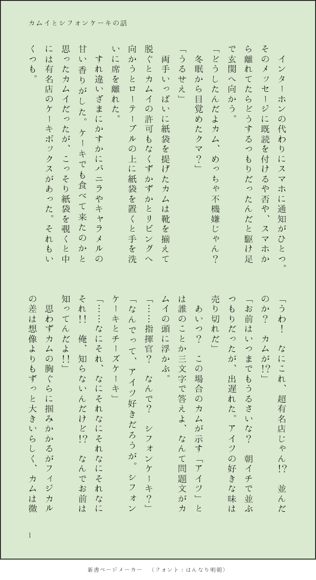 灯夜𝄇☆quiet followPAST過去に新書メーカーで書いたカムイチャンのお話のまとめです。 show all(+46 images) Tap to full screen (size:618x1132).Repost is prohibited Let's send reactions! freqpopularsnackothersPayment processing Replies from the creator Follow creator you care about!☆quiet follow 灯夜𝄇PROGRESS一旦置いときます、メモだし途中真尾笑vsヒーローの妄想、クロスオーバー推し贔屓はしないように最初はしてたけど、煮詰めてく程にどうしても知識と考察に比例して文章の量に差が出てしまう捏造過多、たぶん間違ってることも多い完全な俺得と「ぼくのかんがえたさいきょうの」のテンションで書いてるので見たい方だけ自己責任でどうぞパスワードはこの呟き内に出た人物の名前をひらがな6文字 4168 灯夜𝄇DONEカムイチャン過去の妄言をおかりして、書かせていただきました!書きながらかなり改変してしまい申し訳ないですありがとうございました! 2187 灯夜𝄇MOURNINGまとまらない!ボツになりそう!自分用に書こうと思ってたVメインの話のメモというかなんというかプロット?あらすじ?みたいなやつ 4325 灯夜𝄇DONEブクマしてたぽよみさんの妄言おかりしました!突然はじまり突然終わります 2125 灯夜𝄇MAIKINGぽよみ様への寄稿用原稿案1短くなりすぎるか長くなりすぎるかで没にするか検討中 1229 灯夜𝄇PAST5月の半袖の話を手直ししました当時の文章、めっちゃ読みにくくて申し訳なくなりました加筆修正したものです 4 recommended works nap_p6DOODLE18歳以上ですか?(y/n) ymzknlDOODLEMysterious Blue Love letters 24 jamira24DOODLEオンイベ エアスケブ公開場所。 moimoi1630DOODLEじっきゅ君の夜のお誘い18↑(y/n) fenguoooooDOODLE新年快樂!!! 6kakung17DOODLE #私立ラポール のうちの子たち〜!久しぶりにお絵描きできた!! 姫川しずくDOODLE死んだ!時空の夢妄想(モブ女います)(夢注意) 6 sasaplus_DOODLE「えそうはいくつ焼く(バリバリ)」 2V28iGaDr7uaplgMEMOCoC「えっ、お前まだ1d100クラスに会ったことないの!?」KP:白米軍艦PL:不和 協音/にょろ さん
