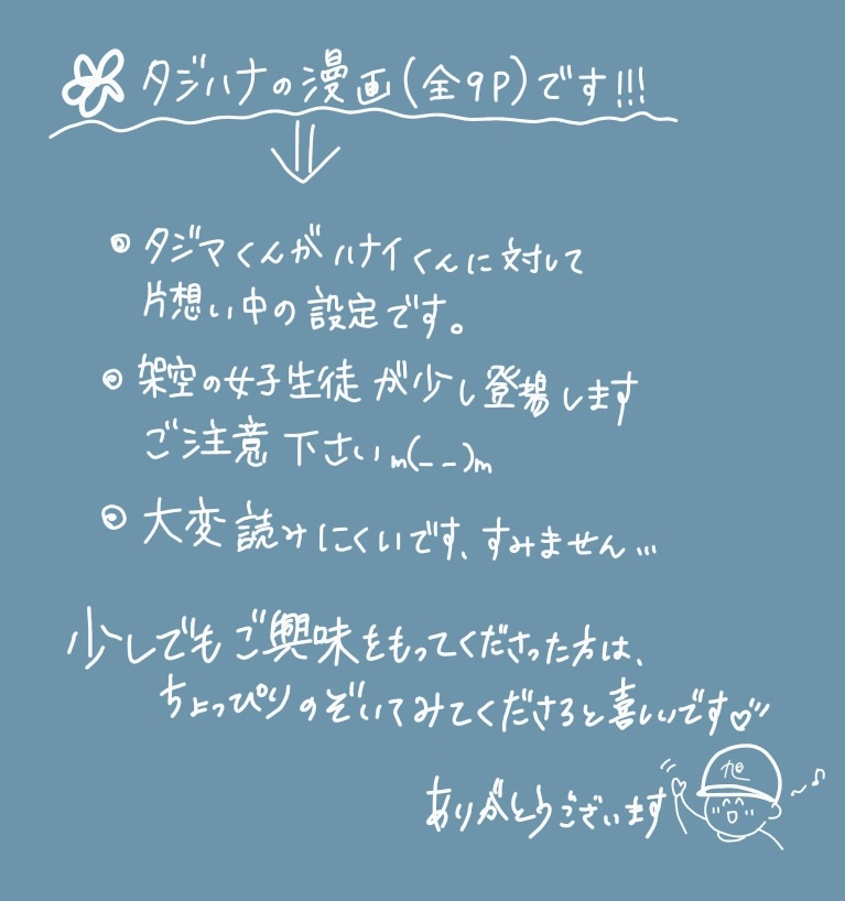 asa_9_hi☆quiet followDONE【白球の行方2024】展示作品田島と花井の漫画(全9P)です!※タジマ→ハナイへの片想い設定あり※架空の女子生徒が少し登場しますので、ご注意下さい🙇 show all(+10 images) Tap to full screen (size:767x818).Repost is prohibited Let's send reactions! freqpopularsnackothersPayment processing Replies from the creator Follow creator you care about!☆quiet follow asa_9_hiDONEしりとりするタジハナ 2 asa_9_hiDONE【白球の行方2024】展示作品田島と花井の漫画(全9P)です!※タジマ→ハナイへの片想い設定あり※架空の女子生徒が少し登場しますので、ご注意下さい🙇 11 asa_9_hiPAST*田島と花井のまとめ* 22 asa_9_hiPASTその他 15