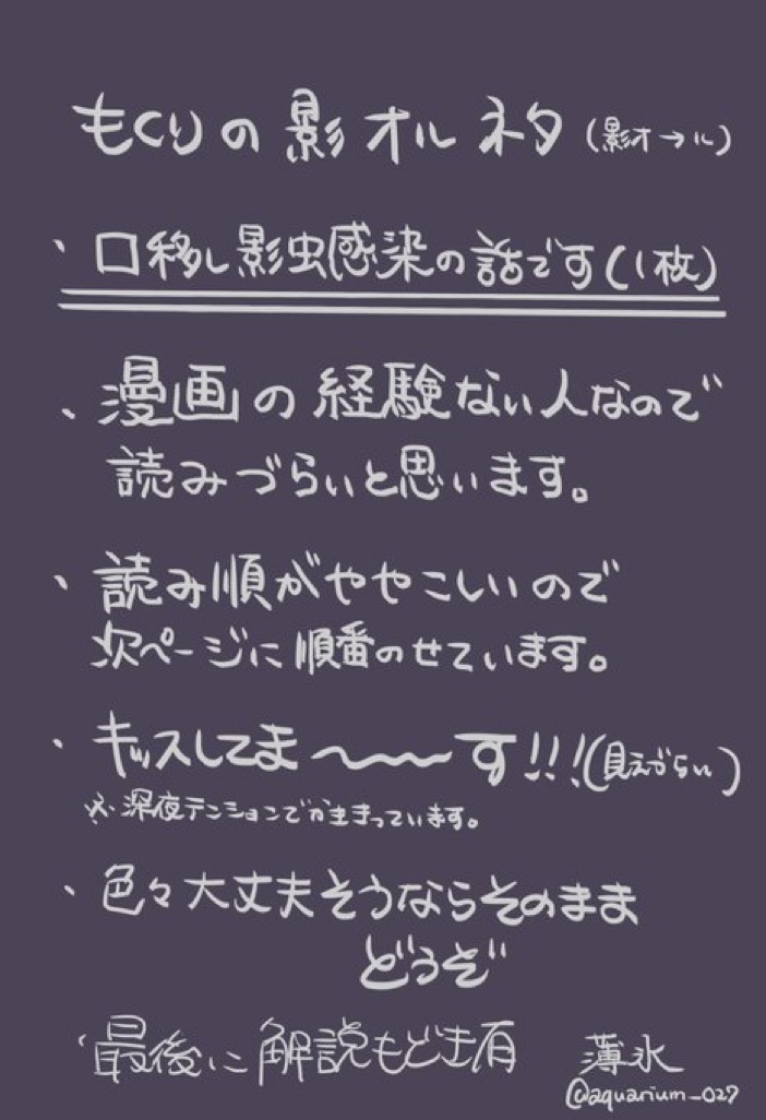 碓氷.☆quiet followDONEもくりネタの影オルです・口移し影虫感染の話です漫画経験ほぼ皆無なので読みづらいです注意書き▶︎読み順▶︎本編▶︎解説もどきです show all(+3 images) Tap to full screen (size:702x1026).Repost is prohibited Let's send reactions! freqpopularsnackothersPayment processing Replies from the creator Follow creator you care about!☆quiet follow 碓氷.DONE12/15~17に開催していたPクミンwebオンリーのオリルイアンソロジーに参加した漫画です初の同人参加、初漫画なので拙いですがお楽しみいただければ幸いです 7 碓氷.DONEもくりネタの影オルです・口移し影虫感染の話です漫画経験ほぼ皆無なので読みづらいです注意書き▶︎読み順▶︎本編▶︎解説もどきです 4 碓氷.DONEオリルイルーイ視点のお話気付かないと思っているオと知ってしまったル 4 recommended works 194DONEモブ鬼に舐められる無惨様 も²@time1010thiefDONE #知己のひとつだけモダモダマダチキ(`・ω・´)⭐︎素敵なタグ企画、ありがとうございます😊 よし.DOODLE 2 ak_Sou25SPOILERアイラスの双眼⚠️ネタバレこいつ(自PC)やってるな、と思ったシーンの幻覚 2 nnobo_chDONE #祝CH40 #シティーハンター #おめでとう🎉#一生大好き💕 ceoceoceoyjhDOODLE ゆりげDOODLEちゅーの合図 南無川MEMOPom・A・Beth 2 ki_osaraDOODLEリバースリバースリバース 現行未通過罰生きるの辛い 死ぬのも怖い もう踊るしかない(ぱーりない!)
