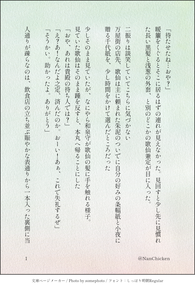 NanChicken☆quiet followDOODLE兼歌の小咄4コマ漫画ににならんかなと思ったけど前によく似たのを書いてたな、と思ったのでここに。泣き虫な兼さんにしがちなのは多分ヘキ #ゆる兼歌 show all(+4 images) Tap to full screen (size:630x928).Repost is prohibited Let's send reactions! freqpopularsnackothersPayment processing Replies from the creator Follow creator you care about!☆quiet follow NanChickenMOURNING大好きな絵本の画家、山脇百合子先生の訃報に接し。餞にあのカステラを焼いてもらったものです支部に置くようなものでもないので、こちらに収めておきます。 NanChickenDOODLE兼歌の小咄4コマ漫画ににならんかなと思ったけど前によく似たのを書いてたな、と思ったのでここに。泣き虫な兼さんにしがちなのは多分ヘキ 5 NanChickenTRAINING悪ぃ …取り込み中だ 出直してくれ…て言われたい NanChickenMOURNING手入れバグ回の、漫画にならなかった部分の切り落とし詰め合わせ供養。単純に時系列で並べ直してありますいつかの遅刻組本丸審神者がいます文章の切れっぱしを単純に時系列にしただけで、小説にもなっていませんが、漫画の前後のことが入ってます。読まなくても良いあれこれ。 6371 NanChickenSPOILER姫鶴さんいらっしゃいまんがネタバレ含みますのでまだなんにも見たくない人は回れ右を。 2 NanChickenDONEhttps://www.pixiv.net/novel/show.php?id=15591812↑支部に上げたこれのゆるい続き自家用らくがきクオリティここの本丸の兼定は多分できてないし、兼さんは悩み多きお年頃 3 related works NanChickenDOODLE兼歌の小咄4コマ漫画ににならんかなと思ったけど前によく似たのを書いてたな、と思ったのでここに。泣き虫な兼さんにしがちなのは多分ヘキ 5 recommended works ふえきPASTとうらぶログ(4年前)※後半薬へし薬 18 七味唐辛子PAST 灯野くずはDOODLE鬼乱とか薬乱とか一乱とか。鬼乱すけべぶっく来週出ます。 5 莫告藻ひじきDONEプリンセスな兄者ちゃんぬりえです。家紋を酷使していくスタイル。一枚目は透過、二枚目はわかりにくそうな箇所の色分けverです。ここのは保存できないんで意味ないのですが…ツイッターにも載せてますので塗りたい方居ないと思いますがツイッターにご一報くだされば嬉しいです。 2 ふたばぎょうPROGRESSむつひぜ本、無事に24ページで終わらせられる見通し立った気がする!!!!えろも入るよ!!!やったね!!! yura_n7PAST貯まった燭青まとめ。 25 しお40DOODLE手紙 灯野くずはPROGRESS以降のページのネームがない(ダメ) 2 灯野くずはPROGRESS鬼乱の進捗。 4