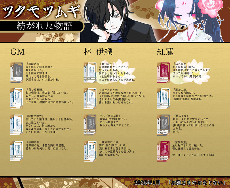 ツクモツムギ「お狐さまのおまじない」の「語り札」集、名付けて「紡がれた物語」です。同シナリオのネタバレを匂わせる箇所がありますのでご注意ください。