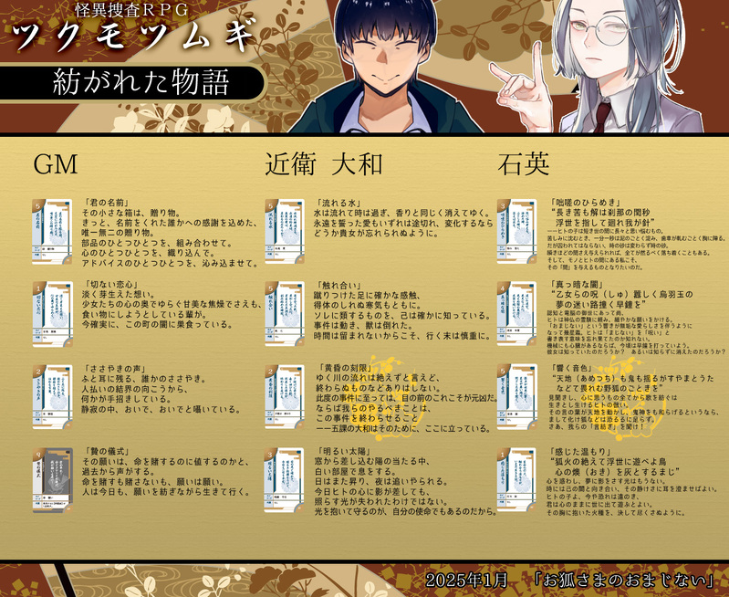 ツクモツムギ「お狐さまのおまじない」の「語り札」集、名付けて「紡がれた物語」です。同シナリオのネタバレを匂わせる箇所がありますのでご注意ください。