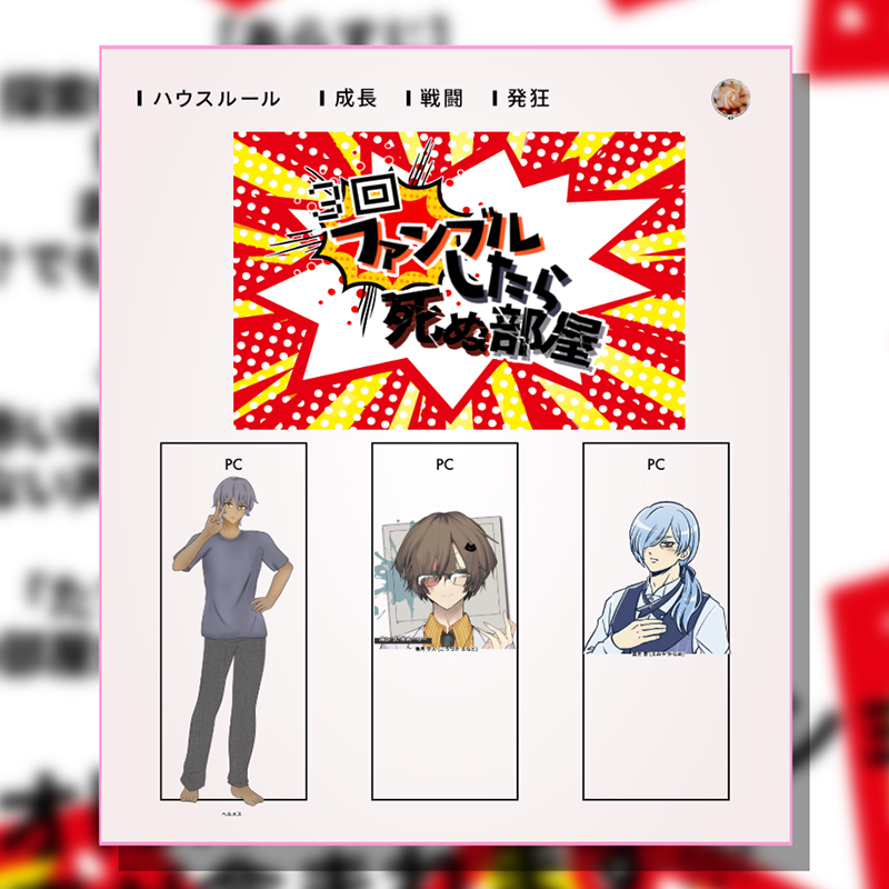 ななきち☆quiet followMEMOCoC『3回ファンブルしたら死ぬ部屋』KPりすPL/PC御厨/ヘルメスkio/香月 学人ななきち/真宮 要 (敬称略) Tap to full screen (size:800x800).Repost is prohibited Let's send reactions! freqpopularsnackothersPayment processing Replies from the creator Follow creator you care about!☆quiet follow ななきちMEMOCoC『The Backrooms』KP御厨PL/PCkio/紅蘭 エリス/朝霞 蜜稀りす/サミュエル・ウィルソン/椚田 蒼ななきち/成瀬 進夢/黒華 ココ (敬称略) 2 ななきちMEMOCoC『箱庭創生プログラム』KP/KPCkio/蘆花宮 真宵PL/PCりす/田住 俊太御厨/帳 真預ななきち/天羽 璃音 (敬称略) ななきちMEMOCoC『3回ファンブルしたら死ぬ部屋』KPりすPL/PC御厨/ヘルメスkio/香月 学人ななきち/真宮 要 (敬称略) ななきちMEMOCoC『このダーリン、チェンジで!』KP/KPC ななきち/香城 蜜貴PL/PC kio/朝霞 蜜稀 (敬称略) ななきちMEMOCoC『わすれものはありませんか』KPただの猫PLx_0/縁筵 好花背黄青/水橋 飛燕灯月 綺来/立村 嘉門ななきち/周藤 弾 (敬称略) ななきちMEMOココフォリアゲーム『脱出!無人島 ~火山噴火するってよ~』PL1 ななきち/アルフレッド・ウォーカーPL2 ひさぎ。/スタニスラス・D・ブラン (敬称略) recommended works eahsu1994SPOILERカエラズノケン ~狂気山脈 第三次登山隊の顛末~ずっとFA描きたいと思っていたエピローグ最高の物語に感謝 7 🍼🥪🦜REHABILIthat one snowy night 🌨 lucky_enenMOURNING炭善/現パロ/大学生なんの問題も起こらないふたりの小話③お互いが大好きすぎるふたりがいちゃいちゃしてるだけ。いちゃついてる状況が状況なのでワンクッション。 12 p_ahm_enSPOILER自探索者たちによる紙芝居型小噺。絵はデフォルメの顔アイコンしかないので注意、セリフ多い。プル夜だけがっつりネタバレがあります、現行未通厳禁。 14 p_ahm_enSPOILERカエラズノケンネタバレ 現行未通厳禁 BL要素有 2 p_ahm_enDOODLEカエラズノケンネタバレ 現行未通厳禁 BL要素有テンプレで使ったらくがき絵 2 p_ahm_enSPOILERカエラズノケンネタバレ 現行未通過厳禁テンプレ BL要素有 2 さくまるDOODLEエレオス男女に載せる漫画ですアルフレッド+赤リュール♂+ヴェイルの現代パロディです紅葉狩りに行く三人の漫画です。アルフレッドと赤リュール♂は大学一年(19ぐらい)ヴェイルは中学二年(14ぐらい)の年イメージです。 5 えびざとうDOODLEリョナ系。流血とかピアスとか。全部過去絵。 5