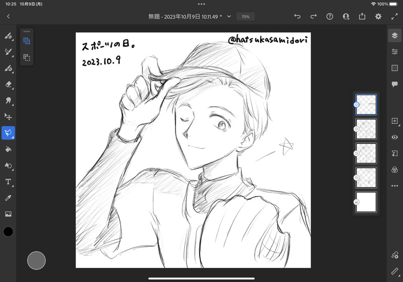 羽士のらくがき(ラフ)所要時間把握の覚書。Adobe Frescoのファイル名はデフォルトだとファイルを新規で作った日時がそのまま表示される仕様なので、端末の時計と合わせるとどのくらいの描画時間が経過したのかがわかります。スポーツの日らくがきは15分、紅茶の日犬の日らくがきは22分で描いている計算になります。ここから書き出したファイルは実際にX(Twitter)にアップ済です。