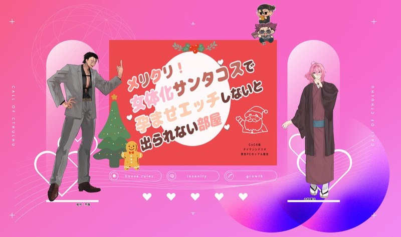 きくらげはくらげではない☆quiet followMEMOCoC「 メリクリ!女体化サンタコスで孕ませエッチしないと出られない部屋 」 著:松田いたみ 様KPC/KP:古村 業火 / 海月PC/PL :佐竹 夾哉 / 耶麻クリスマスだ!エロシだ!女体化サンタコス孕ませエッチだ!メリークリスマス、ごうきょ❤️🔥🐱 Tap to full screen (size:2202x1305).Repost is prohibited Let's send reactions! freqpopularsnackothersPayment processing Replies from the creator Follow creator you care about!☆quiet follow きくらげはくらげではないDONEProject : Sm;ley HO哀神南 真紅(じんなん しんく)30歳。こいつに関しては語れることがあまりないぜ!!!生きて帰れると良いね…………。 きくらげはくらげではないMEMO賭留の表情差分ネタバレは全くないけどサングラスオフ差分なので個人的にワンク入れてます。😎「サングラス取らないでよ~セクハラなんだけど~」 2 きくらげはくらげではないDOODLEスススス HO1クズ鐘星 賭留(かねぼし かける)28歳。ウオ~~お金大好き!!!!!自称パチプロの変なグラサン野郎だよ。弟はまともなのに、何故兄は…………。 きくらげはくらげではないMEMO覓夢の顔周りの資料(サングラス無し) きくらげはくらげではないMEMOCoC『 出られない部屋vs付き合ってない俺たち 』 著:地雷屋さん 様 𝐊𝐏𝐂 / 𝐊𝐏:鐘星 覓夢 / 海月𝐏𝐂 / 𝐏𝐋:天樫 孌 / 耶麻 きくらげはくらげではないDONE誰がロックを殺すのか HO3鐘星 覓夢(かねぼし もとむ)26歳。数字や人気を気にする男。珍しくタレ目の探索者だ!!!!!! recommended works Lian0809DOODLE 2 DontmindmeDOODLE弓鄭成人yes/no Asagohan_osushiDOODLE花ヶ丘、蛾と踊るげんみ❌ 12 毒りんご。DONE昨日Twitterの方で出したやつです RabbitMint1DOODLEレピドとリヴィでCP紹介シートやってみました。嫉妬深さの項目、レピドはほぼ無い子なので書き忘れじゃないです。ロキとリヴィのも要るかな…こっちも考えてみます。 bellhop666DOODLEにょた兎の虎兎 Ds___03DOODLE그거 낙서 2 _user_nullDOODLEtumblr request (is it a request if i asked for ideas?)tumblr リクエスト (アイデアを求めたのなら、それはリクエストでしょうか?) Niboshi_TRPGSPOILERPalanormal Crime 現行未通過❌弊HO5の落書き 3