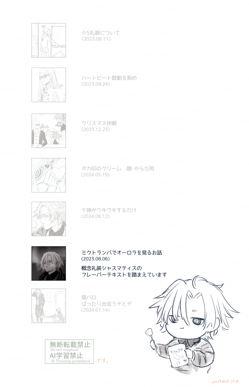 sayu☆quiet followDONE2~5ページくらいで投稿していたものの再掲です。 show all(+6 images) Tap to full screen (size:1736x2696).Repost is prohibited Let's send reactions! freqpopularsnackothersPayment processing Replies from the creator Follow creator you care about!☆quiet follow sayuDONE魔術の光では影のできないデくんのお話です。最初はミクトランパ内で疑似フィールドワークをしている想像でしたが、別に現世(?)にパ内から遠征してるのでもいいな…と思いました。 3 sayuDONE2~5ページくらいで投稿していたものの再掲です。 7 sayuDONE2~5ページくらいで投稿していたものの再掲です。 9 sayuDONE2~5ページくらいで投稿していたものの再掲です。 14 sayuDONEミクトランパで寝落ちしたテ神のお話です。描いている途中で服は魔力で編まれているのでは…?嵩張らないのでは…?と思いましたがふんわり読んでいただけたら嬉しいです。最後のページに少年と父親の幻覚をみています。 10 sayuDONE人類の定義を選んだのもテスカトリポカを召喚したのもデイビット君 というお話 36 recommended works わぶ.DOODLE天🐉人とペット🥽本誌が辛いのに、なぜ… konoha_reireiDOODLE 我不知道DOODLEngis大学生凪x小学生小世,注意避雷 5120 hiduki_lauridqDONE24年7月分ドラクエ10フレのエル子ちゃん、ハクオウ 2 Liqp_tgTRAINING1日1枚過不足なくなんでもいいから筆を持つ訓練2024.12.31〜2025.1.20 21 18_escargotPASTパイズリされた受け俣さん再掲18↑?(y/n) 2 Onigiriland.comDOODLE🏇 tumariMarineDONE書き納めです。大晦日っぽくはなりませんでした。いたしてないからR-18ではない。あってR-15ぐらいか?炬燵でいちゃつくシズイザが見たかっただけ。というより足コ…キが見たかっただけ。またリベンジしたいな。今年もありがとうございました。来年もいっぱい書いていきたいですね。 3 Morituki_MainDOODLE【フラウィつめつめ】上:植木鉢から出てくるおはなのフラウィ真ん中:フラウィの怖い顔が癖になる下:Nルート終盤のあれ