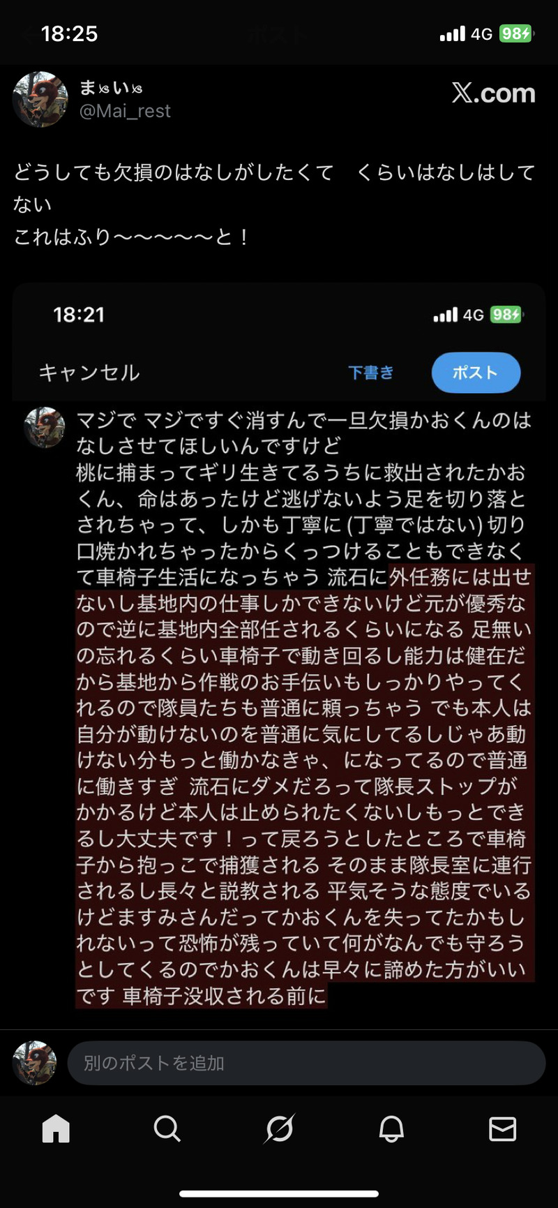 Mai_rest☆こそフォロメモこれ関連のはなしネタまとめ場〜欠損のはなしをしているので注意気が向いたら追加するかもしれないししないかもしれない2026.1.19 追加あまりにも癖と恥なのでR-15リス限ゆるしをあたえよ すべて表示(+6枚) タップで全画面(原寸:828x1792)無断転載禁止 リアクションをたくさん送って応援しよう! よく使う人気おやつその他支払処理中 作者からのリプライ 気になる人をどんどんフォローしよう!☆こそフォロ Mai_restメモこれ関連のはなしネタまとめ場〜欠損のはなしをしているので注意気が向いたら追加するかもしれないししないかもしれない2026.1.19 追加あまりにも癖と恥なのでR-15リス限ゆるしをあたえよ 7 Mai_restらくがきインスタント的ますかおすけべ〜リベンジ編〜前に書き損ねた騎乗位再チャレンジ言うほどすけべではない濁点と♡は好きなだけ書きましたえろくはないがやることやっているので成人済リス限(18歳未満、高校生以下閲覧不可)追加希望の方は18↑と分かるアカウントからリプライ、もしくはDMにてお声がけください 2803 Mai_restらくがきいつものちったいねりまちゃんの番外的なちびたちはおねんね中につき不在たいとしおが喋るだけ ちょびっとだけたいしお風味にゃんといんなみに言及しているだけのあれそれ捏造しかないので ごちゅういください相変わらず「先輩」呼びです(趣味) 1334 Mai_restらくがきいつものちったいねりまちゃんの妄言しおんパパとごはんの回三人でご飯食べてるだけのやつですあと相変わらず「先輩」呼びをさせています(呼んではない)こちらはますみさんを野生動物かなにかだとおもっている ごちゅういくださいどちらかと言えばますかおのオタクなのでそっちに寄っているかもしれない それもごちゅういください 1395 Mai_restらくがきメリクリますかお(遅……)まだ年明けてないのでクリスマスです(暴論)聖夜にかこつけてセッッッするだけのますかおすけべですさほどえろくはないけど♡も濁点も飛び交っていますので注意 あとなんかエッッッな下着の話しとか出てきます それも注意成人済リス限(高校生不可)(18歳未満不可)追加希望の方はリプライもしくはDMにてお声がけください 3417 Mai_restらくがきずっと吐き出してるちったいねりまちゃんの妄言。しおんパパの回。気が向いたら書いたり書かなかったりするやつ。ネタがネタなので一応ワンク。捏造で捏造を捏ね回して捏造で包んだ感じのあれそれ。しおんの「先輩」呼びがかわいくてすきなのでそっちで統一してます。ますかおのおたくなのでそっちに寄っているかもしれない。ごちゅういください。 1573 おすすめ作品 ネコメコらくがき菊耀,年龄操作有 陸離できた梅雨の時期のお話。暑い中マスクしてお出かけした時に伊之助でもこの時期キツイだろなーと思って。やっと完成できて良かった😭長かった次回はもう少し軽めに描きたい。 16 亞莉亜(アリア)らくがき【NSFW/🔞】久しぶりのシャソニ参考ポーズを描いてみた aidiomok1215らくがき 3 亞莉亜(アリア)らくがき【NSFW/🔞】ソニックの見た目にそぐわないチンチンを見て発情期中のクロノスは興奮気味。お腹にソニックのおチン当てられてはお腹の上でコシュコシュさせて焦らすソニック kinjiang_yelineらくがきYejun女裝注意⚠️🔞 ゴッゴッゲッゴッゲッゴッゲッらくがき攻殻機動隊のチンポン兵愛玩用ロボ娘 선더맥퀸🔞らくがき선더맥퀸X모브 갱뱅물(윤ㄱ물(?))password:18세 이상이며, 갱뱅물을 안꺼려합니까?y/n? 2 カキカキできた 3
