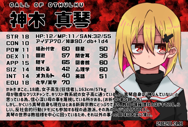 或夜🍆☆quiet followMEMOうちの探索者キャラシ一覧。とりあえず作ってる分だけ。立ち絵とか修正していきたさはある。└(・ω・)┘ show all(+22 images) Tap to full screen (size:1748x1181).Repost is prohibited Let's send reactions! freqpopularsnackothersPayment processing Replies from the creator Follow creator you care about!☆quiet follow 或夜🍆DOODLE🥕じらくがき自陣喫茶行きて〜〜〜〜〜〜〜〜〜の願望落書き 或夜🍆MEMO◾︎CoC 『 VOID 』 HO2 新型アンドロイド - ニケ 2025.10.2~立ち絵、SD(おまけにラフと没立ち絵) 13 或夜🍆MEMO◾︎CoC 灰になってよかった PC - 虹坂 灰狸立ち絵、SD詰め合わせ 5 或夜🍆DOODLE※トゴスマ、ヴィラデビげんみ❌自陣に関するメモ&落書きなどまとめ。増えるかも。 4 或夜🍆MEMOCoC「東京ヴィラニカデビル」HO1 - 楔 興梠 万里立ち絵とちみと。 2 或夜🍆DOODLEトゴスマ自陣🫶 5 recommended works kieruDOODLEよりむざ!雑!昨日美人が出てきてびっくりしたよ、、、刀かじたのしみ、、成人済の方のみ ぽめ🌞💎DOODLEなんか描いておかないと…って気になった 8131nomanomaDOODLEあとまつ げんみ❌ 差分 3 10dendenmusi10DOODLE masamune58DOODLEマヨマヨ 2 何でも食べてしまうu-taMOURNING▽CoC:マウンテン・シャーク 〜登⼭家VS雲海に潜む悪魔︕巨⼤鮫は笑う〜――――――――――― KP:杢野(PC:Yonah) PL: 冬真(PC:Canis lupus) pikapika(PC:カカカ) 鮫肌(PC:サカタ)ゲスト:しゑこニキ ✧✧ NightOut ✧✧――――――――――― ▸▸▸End. 全生還 onokanata2DOODLE落書き yutannpoDOODLE面影 musitobiDOODLE子供化大村/カミール/中村センセ/イッチ