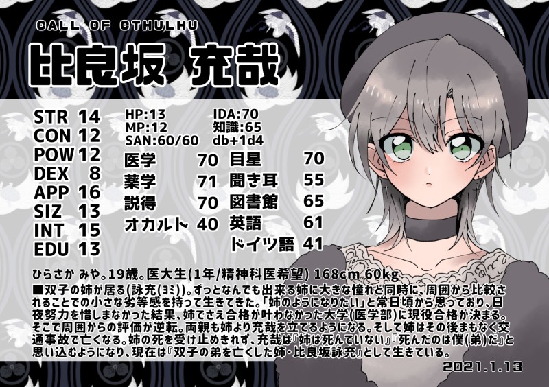 或夜🍆☆quiet followDONE「黄泉孕み」医大生・比良坂充哉くんのCS&立ち絵まとめ。1番最後(11枚目)はシナリオ後CS。 show all(+10 images) Tap to full screen (size:1675x1181).Repost is prohibited Let's send reactions! freqpopularsnackothersPayment processing Replies from the creator Follow creator you care about!☆quiet follow 或夜🍆DOODLE🥕じらくがき自陣喫茶行きて〜〜〜〜〜〜〜〜〜の願望落書き 或夜🍆MEMO◾︎CoC 『 VOID 』 HO2 新型アンドロイド - ニケ 2025.10.2~立ち絵、SD(おまけにラフと没立ち絵) 13 或夜🍆MEMO◾︎CoC 灰になってよかった PC - 虹坂 灰狸立ち絵、SD詰め合わせ 5 或夜🍆DOODLE※トゴスマ、ヴィラデビげんみ❌自陣に関するメモ&落書きなどまとめ。増えるかも。 4 或夜🍆MEMOCoC「東京ヴィラニカデビル」HO1 - 楔 興梠 万里立ち絵とちみと。 2 或夜🍆DOODLEトゴスマ自陣🫶 5 recommended works 7hiyoko_SDONE20240112蜘蛛の糸余さず連れて(以下、蛇足兼ひとりごと)後悔を全て抱えて行く人だから、地下闘技場も地獄だけど、出た後も、糸は登り続けている最中のように思う。登る間に出会った他人も、縁にも、きちんと向き合う人だから、後悔と添い遂げて欲しい。 ひじぎん工房DOODLEモフフサのスケッチ記録 6 yutannpoDOODLE呼吸パ+おまけ 2 masamune58DOODLEカイさんおたおめ㊗️2024 伊夜🎐DOODLEさくすお / 사쿠스오 / 櫻枋 🌸🫖埃及paro王🌸x大祭司🫖換上了祭典服飾的大祭司🫖,在練習祭典用的舞蹈,王🌸在一旁看著😌跳完後~🫖:王!覺得我跳得如何?看著迷的🌸:非常...美麗 2 10dendenmusi10DOODLE「だって、これどうしたらいいかわからなかったんだ」 hiyaykko_05DOODLE1P 一人称矯正教室2P この後口きいてくれなくなりました 2 雪風(ゆきかぜ)。DONE上半身裸翠くん。一応ワンクッションです XpekeponponDOODLEDX3『Truth or Fiction』PC3噤深 シヅカhttps://yutorize.2-d.jp/ytsheet/dx3rd/?id=aPRfAs 7