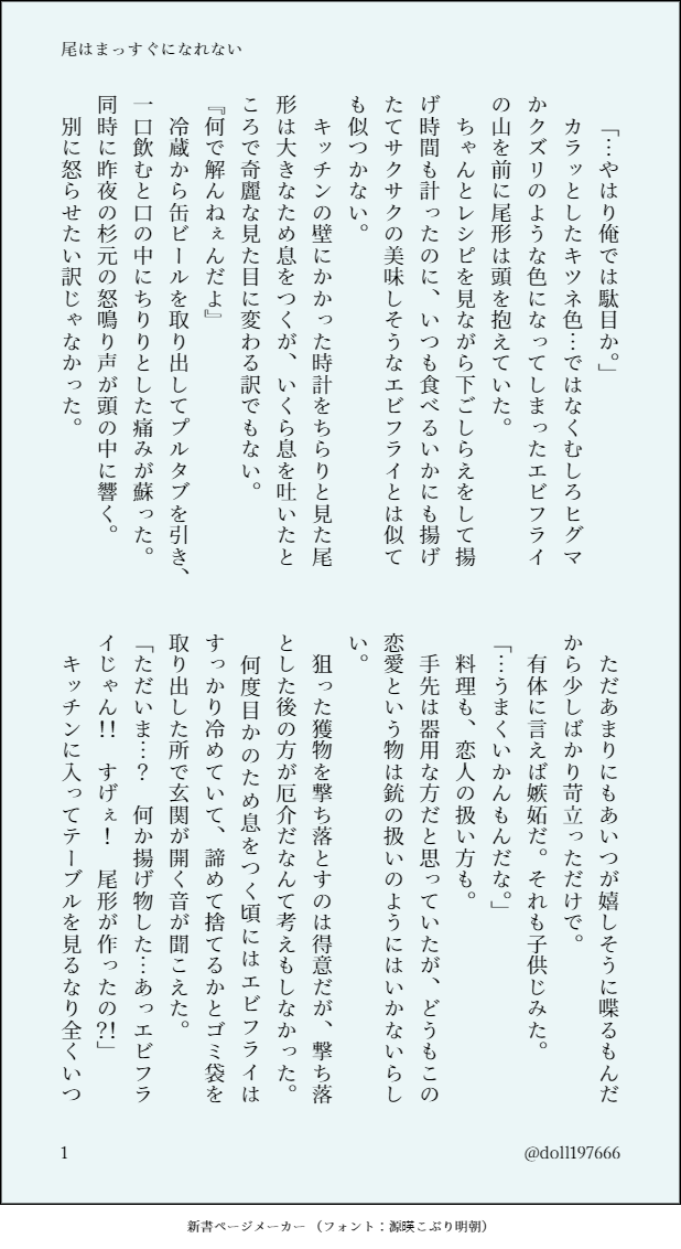 doll197666☆quiet followDONEエビフライの日で尾杉。我が家の尾杉の喧嘩は美味しい物を食べれば大体解決します。 #尾杉 Ogata/Sugimoto show all(+2 images) Tap to full screen (size:618x1132).Repost is prohibited Let's send reactions! freqpopularsnackothersPayment processing Replies from the creator Follow creator you care about!☆quiet follow doll197666DOODLEお題「大切な人/特別な時間」で書かせて頂きました!謎平和時空のハピバ信洛です。パスは英字数字 3034 doll197666DOODLEお題「サプライズ」で書かせて頂きました。〇番煎じかと言うサプライズっていうかほぼドッキリ。既にデキてる信洛です。パスは英字数字。 4 doll197666DOODLE棒状アイスを食べる杉にムラムラする尾はなんぼあってもいい。 808 doll197666DOODLEデキてる四十二の朝チュン。寝起きを襲う十二が書きたかっただけです。パスは英字数字。 1690 doll197666DONE信洛ワンドロワンライにてお題 「星空」にて参加させて頂きました!出来てる信洛が遭難する話。🔑は英字数字 2023 doll197666DONE信洛ワンドロワンライにてお題「雨」にて参加させて頂きました!本編後、デキてる信洛で雨の日は揃って不調になる二人です。パスは英字数字 2180 related works シオンDONE尾杉、蓄光アンソロのWeb再録です。 5 shimo_hakariMAIKING誰か色塗ってくれねぇかな doll197666DONEポッキーの日で尾杉。ポキゲしてません。 3 @mitakarmDOODLEツイに上げた時に画像が悪いのがあったのでまとめました。ツイに上げなかったオマケ付き。練習絵。 5 馬刺梅(梅)DONEって未来があればいいなぁ 696969KINWARICHMEMOน่ารักๆ 💖💖💖💖(osugi)What Sukimoto likes to eat?(answer in English) 3 giselle_crowngkPROGRESSんぐー トミーPAST2021年おにしさん主催の尾杉職業アンソロに寄稿したものです。杉元さんの職業は…秘密のまま😄 11 shimo_hakariMOURNING攻めのシャツカーテンがかかるので供養太ももで隠れるから小さくみえる気がする