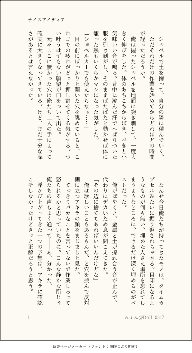 Doll_0317☆quiet followINFOhb中心不穏アンソロジー『仮葬』に寄稿させていただいたお話のサンプルです。⚠︎︎不穏⚠︎︎全て捏造の二次創作 show all(+1 images) Tap to full screen (size:618x1132).Repost is prohibited Let's send reactions! freqpopularsnackothersPayment processing Replies from the creator Follow creator you care about!☆quiet follow Doll_0317DONE『やっぱり笑顔が一番似合う!』(全16p)⚠︎年齢操作⚠︎軽い体調不良描写とある企画で書かせていただいたお話の再録です。バグで小さくなってしまったsrと、ほか3人のお話。メインで登場するのはsrとhbです🕊️ 16 Doll_0317DONE『36.8℃のバグ』⚠︎︎年齢操作を含みます⚠︎︎バグで幼くなったsrとアイスのお話🍨vlt全員が出てきますが、rm4メインのお話です。あさみさん(#ipe_sumari )とワードパレットの共通ワードを使ってお話を書きました〜!🥳遊んでいただき感謝です🫰お借りしたワードパレットは、Xにてこちらの作品URLを貼ったツイートのツリーに繋げてあります! 8 Doll_0317DONE『人らしい人による、人とは違う復讐』はたち/「……これでも我慢したつもり」相互さんから頂いたセリフを元に書いたお話です。⚠︎︎流血・暴力表現があります⚠︎︎人(モブ)が死んでいる描写があります 5 Doll_0317INFOhb中心不穏アンソロジー『仮葬』に寄稿させていただいたお話のサンプルです。⚠︎︎不穏⚠︎︎全て捏造の二次創作 2 Doll_0317PASTメイド潜入任務rm4⚠︎rm4が女装してる⚠︎書きたい所だけ 短い⚠︎捏造しかない上記の注意事項が大丈夫な方のみ🔑『ok』でお入りください 2 Doll_0317DONEセラフが電流に対する耐性をつけるまでの話(全3頁)⚠︎全てが妄想の二次創作です。セラフの幼少期及び父親の捏造・痛い描写を含みます。以上の注意事項を確認して頂き、全て大丈夫だよという方はokでお入り下さい。 3 recommended works rntnxinranDOODLE茶屋的炭子 26 sataneseMDONE总而言之是第一次尝试的四爱,写得各种意义上水平不高不下,也许会二修密码:18↑?(yes/no) 6857 節約したいよ清原DOODLE体調不良キミトスらくがき元気元気おちゃらけ優お兄さんに体調不良が刺さりすぎた魂の方は本当に休んで欲しいですごめんなさい 3 生わさびDOODLE⚫️🟠メイン 2025 6 由貴(ゆき)TRAINING【カラー絵練習の露✒️⚠️差分】素材の液体ブラシ楽しかった☺️笑 illustonomet37INFO『はじめての人』の原型。本にした内容はここから加筆修正したものです。初夜とありますがここに載せたものは全年齢向けの内容になってます。※玄弥はにょた 50 沙藤 とねり(仮)DOODLEラスト一枚ちょっと注意 4 piyoman_pandaPAST高律で惚れた弱み的な話。強引に求められるとそれに甘えて乗っかりたくなるから困る、みたいな律っちゃん。 4 907DOODLE向き合ってするとシーツや枕じゃなく自分に縋ってくれるのがうれしくてたまらない、なんて後ろ暗い欲はキョーダイには秘密。 2
