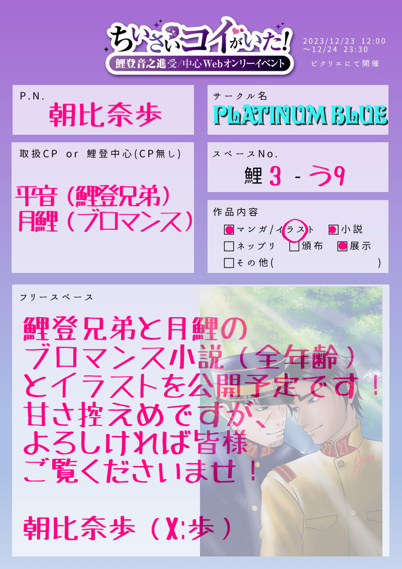 ashvenus☆quiet followMENU #ちいコイ Tap to full screen (size:800x1132).Repost is prohibited Let's send reactions! freqpopularsnackothersPayment processing Replies from the creator Follow creator you care about!☆quiet follow ashvenusDONE鯉登兄弟小説 3265 ashvenusDONE月鯉小説 6491 ashvenusDONE鯉登音之進2023年誕生日絵🎂 ashvenusPAST過去のTwitterつめ。 14 ashvenusMENU related works mekoneko69DONE月鯉SS・明治軸黄金争奪戦から6年後の設定当時の鉄道事情や陸大のことは付け焼刃程度の知識+憶測も入っていますので、細かいことは気にせず大らかに読んでいただけると幸いです。 4125 ashvenusMENU ptuk_sDONE月鯉♀ 詩花集 「花」(藤村さん(@jfjmr_gktkR07)主催)に寄稿させていただいたR18月鯉♀漫画🔞です。#ちいコイ おめでとうございます🎊 高校生または18歳以上ですか?(y/n) 9