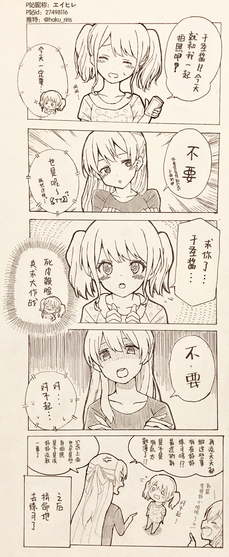 这里是一个汉化组 专注于彩千圣相关内容的汉化,组里有希卡、白羽、五风三位日翻,清洁工、字母两位韩翻,以及小柃一位英翻,所有翻译的漫画里都有作者的主页链接,请喜欢的话务必去给原作者点个赞或者关注,谢谢。 ☆quiet follow Yell with Emoji POIPOI 51