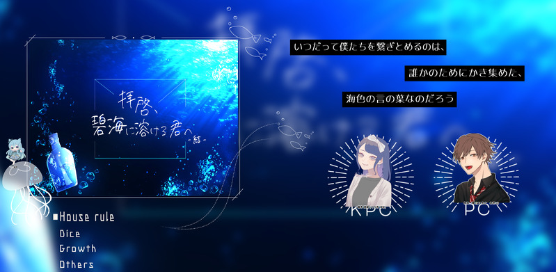 m_6nnk☆quiet followMEMOcoc “拝啓、碧海に溶ける君へ-結-”*11/12KP:えむ-倉木 波菜PL:なずちゃん-橋本 輝 Tap to full screen (size:2049x1003).Repost is prohibited Let's send reactions! freqpopularsnackothersPayment processing Replies from the creator Follow creator you care about!☆quiet follow m_6nnkINFOcoc “愛罠蜂”*10/4KP:あんねちゃんHO1:小綿 茉希/たまぴHO2:音瀬 あめ/えむ▷END愛 m_6nnkINFOcoc“快刀乱魔”KP:ロッバさんHO1:山咲 詩桜/杷茶さんHO2:漣 静寂/朔弥さんHO3:天津 夜凪/ねこ茶さんHO4:雨夜 雫月/えむ▷シナリオクリア:3生還1ロスト m_6nnkMEMOcoc “夏に逃げ水”KP:えむ-蓮見 藍華PL:なずちゃん-白羽 めい m_6nnkMEMOcoc “君が魔法で笑えば”*9/7.8KP:えむHO1:花咲 みちる/おかゆちゃんHO2:夜乃森 綺麗/しばいぬさんEND.嫌でもね m_6nnkINFOcoc “紫陽花は六月の嘘”KP:おかゆちゃんPL:えむ-莉汐▶四季送り夏継続 m_6nnkINFOcoc “ぼくらのそうさい”KP:おかゆちゃんPC/PLHO1:花崎 冬空/えむHO2:緑川 希空/なずちゃん✧END 蛍の行方 -両生還- recommended works หมาหมึกกุ้งDOODLE18↑ (yes/no) pinl0vDONE2024/06/08-09開催のパバステ6の展示物です。2023/12/17発行の「今日という日が」/44P/成人向け のWeb再録です。当時お手に取っていただいた方、誠にありがとうございました。初めての同人誌なので思い入れが深いです。冷や汗でびしょびしょになりながら入稿作業をしたのが昨日のことのようです。 51 necocoDOODLE何気ない質問と答えから派生する彼の話🐟 如月 かのん@オリキャラ系ゲームDONEオオトリさんへのエアスケブ。WM無し 2 Eri_14toshiDOODLEPinterestを参考に気分転換にバイク描いた dk_mn_satiareMOURNING鬱鬱鬱鬱鬱鬱鬱鬱鬱鬱鬱鬱颯×基盤×青い血簡単に言うと元ネタ16話 2 エチチがにDOODLE人魚🌰第3形態⚠️一応鱗とかの集合体注意 kitida48DONECoC6版『大奮闘! 真夏のロンリースプラッシュ!』卓後エンドカードです。対戦ありがとうございました! Misuzu_funartDONE2024藤岬兄弟ハロウィン 3