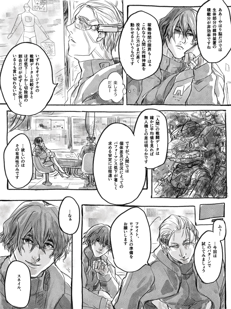 斉藤思按☆quiet followTRAININGスネイルくんの最悪の部品検証実験にフロイトくんが協力してる可能性があると聞いてなんかもう思ったよりガチで仲良しなのでは??何???みたいな勢いで描きたいところだけ出してしまった漫画 もうちょっと頭の良さそうな台詞を思いつきたかった #フロスネ Freud/Snail #AC6 show all(+2 images) Tap to full screen (size:1536x2048).Repost is prohibited Let's send reactions! freqpopularsnackothersPayment processing Replies from the creator Follow creator you care about!☆quiet follow 斉藤思按DONEガタケにて発行した既刊「恋路を駆けるが如く、故に至って純粋。」の前半部分を前回のイベント限定で公開してたのですがとりあえずまた公開しておきます。紙の方は現在完売しております。ありがとうございます… 21 斉藤思按DONE前回のフロスネWebオンリー開催記念アンソロジー「Beyond the two light」にて寄稿させて頂いた弊社フロスネの漫画です。Webでの公開可となりましたので展示しております。以前ツイッターに流していたフロ吸いをする限界連勤閣下のゆるいらくがきが元ネタです。ほんとアンソロがとても良すぎるのでもしまだお持ちでない方はぜひ他の方の作品もたっぷり収録された本の方を…ほんと良いので… 9 斉藤思按TRAININGWebオンリーのカウントダウン企画で描かせて頂いたもののまとめです。こういう企画で全部描けたの初めてです。やったぜ。 3 斉藤思按DOODLEツイッターに垂れ流したらくがきまとめです。最新のまででちょっと少なめ。 10 斉藤思按DOODLEデスクの上ですけべに励んでいたフロスネの所にうっかり報告に入ってきてしまったモブ視点のらくがき漫画。すけべでそれどころじゃなくなってる閣下だけ気付いてない。 斉藤思按DOODLEとあるフォロワーさんのつぶやきから巨大ぷにもちフスが自然界の災害のごとく無邪気に暴れるのが見たいという謎のヘキを爆発させて衝動で描いたやつです。また何かの折に増えるかもしれない。 3 related works masato_zattaDOODLEペイターとホーキンスホーキンスさんとはもっとお近づきになりたかったんですが…???どうして…ペイター君はまぁ多分部下にいたら可愛いねとも思ってしまうそれはそれとしてコイツ…ってなる身長イメージ等は全員描けたら改めて数字も出したい 2 LabanS_LabDONEハロウィン?なので肌色多し仮装ウォルター※髭描くの忘れたので追加PASS:NH√本の書き下ろしの最後の言葉 2 ShierinDOODLE2週目が終わって3週目始めました!AC6の戦友ラスティについて考えてました。ラスティについて考えてるときはサウダージになっちゃう(一つずつ分かんなくなる男)。 2 斉藤思按TRAINING数多の実験体の犠牲で作られた閣下の概念絵。なんか趣味に走りすぎた上に普通にグロめになったので注意 2 VX_FictifMEMOア社ヴェスパー部隊長就任にかかる通過儀礼に関する覚え書(R18) タイトルの通り覚え書程度のメモです。オキラス、フロスネ、ペイホー、モブスウィへの言及あるのでお気をつけください。自衛のほどよろしくお願い致します。鍵→成人ですか yes / no 787 ShierinTRAINING【幻覚】フロイトとラスティの外見イメージというか、こういう方向でいこうかなと。全キャラ並べてキャラデザしないと、被った被らないが分からないですけどね。そもそもSTV画稿自体が『誰が誰と明言されていない』というトリック有るので。 2 ShierinTRAINING幻覚スネイル(司令部の姿?ヴェスパー部隊正装?)できた!表情が思ったより穏やかめになっちゃった。次は全身でポーズ付けて描く。 ぽみとMEMOAC6 賽は投げられたルートクリア感想これでもう何も気にせずネットで情報あさりまくれるぞー!絵も描きたいし、人様のトークも聞きたい💨 2 masato_zattaDOODLEナイルと五花海こっちももう確定大豊娘娘の流行りに乗りたかったのを抜きにしても色んな意味で癖が出過ぎてるその為のぽいぴくなのでヨシとする安定の湿度 2 recommended works CELIDONEバルテウス終了後の隙間妄想。チャプター1のネタバレが少々。CP要素ほぼなし…バルテウス終了後の報酬画面にて「報酬加算」の詳細の「特別手当」と戦場においてのお互いの関係など色々書いたものです。 3 masato_zattaDOODLEイグアスとヴォルタ2周目C3途中なので案の定変わる可能性はある情報ログ湿度高くない…?文字書いてるともっと湿度が高くなりそうなので途中で止めました。レッドガンもいいキャラ多いよね… 2 まどこSPOILERアーマードコア6の二周目感想まとめ! 楽しいけどしんどすぎ!!!621に対する感情は三周目まで含めた総括をあとで書こうと思います※ネタバレと妄想過多!あと三周目まで既に行ってる人間なのでその時の視点も少し入ってます! 4 VX_FictifMEMOア社ヴェスパー部隊長就任にかかる通過儀礼に関する覚え書(R18) タイトルの通り覚え書程度のメモです。オキラス、フロスネ、ペイホー、モブスウィへの言及あるのでお気をつけください。自衛のほどよろしくお願い致します。鍵→成人ですか yes / no 787 CHOI_BUN_SADOODLEポッキーキスがしたかったフロイト 2 chomo_ekc767DOODLE「正気かこの女」この前の五