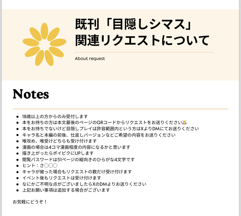 ひおぺりん☆quiet followINFO既刊「目隠しシマス」関連リクエストについて Tap to full screen (size:1170x1048).Repost is prohibited ひおぺりんDOODLE大人向けだけど大人向けすぎないなるゆいR15pass:◯◯◯◯◯サバイバー ひおぺりんDOODLE女攻め 途中です! ひおぺりんDOODLE😴なるゆいです4コマです続きます描けたら… 4 ひおぺりんDOODLE混乱するTLを眺める社長とひょっこり現れた彼女成宮が何の仕事してるか教えてくれたけど理解したようでしていない朝日奈 2 ひおぺりんDOODLE付き合ってるなるみやとあさひなオチは任せた… ひおぺりんDOODLE描き方忘れてしまった…弁慶さん recommended works pocha_picsPROGRESS起きちゃったから正月な雑キのラフを描いてみたりなど Lapis0_4DOODLEド深夜テンションで描いた悠アキ(ちょいセンシティブ)良ければ感想下さいパスワード 18以上→yes/no mochayu01DOODLE伝説の始まり らるるDOODLE騙すつもりが絆されて4にて掲載させて頂いた漫画その2 ヴィラヴィラ編 9 茄子海月PASTイチャえろリサイクルまとめ、ぴっくぶでは非公開にしたのでこちらにまとめました。今読み返すとアタタな内容も多いのですがこれも一つの記録として。 23 スコーンのお裾分けよ〜DOODLE自キャラ有りの落書き没漫画の一部や備忘録(アテにしないで)があるけど公開しない予定だった絵ばっかりなので超汚いぜ‼️‼️ 6 ジュミナDOODLEヴェノたや。 2 wkrmsDOODLEシスネハ♀ 迷思+妄想(日語下手 2 鼠鼠开饭咯DOODLE恒星时刻🚗