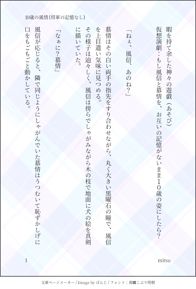 mitsu☆quiet followDONE10歳になっちゃった風情の小話😌将軍の記憶はないよ!※年齢操作、OOC #天官賜福 Heaven Official’s Blessing #tgcf #风情 flavor #fengqing show all(+7 images) Tap to full screen (size:630x928).Repost is prohibited Let's send reactions! freqpopularsnackothersPayment processing Replies from the creator Follow creator you care about!☆quiet follow mitsuMOURNING风情风🔞えろはないけど上下の煽りあいしてるだけ。とっても短いです。 mitsuDONE祝師兄と慕情。(全年齢)慕情は太子殿下にスカウト前。妄想です。※殿下専属の雑用係というより皇極観全体の雑用を受け持っていたという勝手解釈。 2 mitsuDONE風情アンソロ「言の葉が肩を並べた日」寄稿作品邦訳2巻過去編の内容、及び筆者の妄想捏造を含みます。※解釈違いなどご了承下さいませ。 7 mitsuDONE仙楽時代の、トリオのお茶会です。🍵(捏造)お茶の淹れ方もあんまわかってません。ネタバレあるとすれば原作邦訳2巻までの範囲です。 10 mitsuDONE🔞喘ぎのみセフレ関係(だけどどんどん慕情を好きになっていく自分を認めたくなくてなんとなく彼女つくっちゃった風信と、それを受け入れながらも風信と真っ当な付き合いを望み想い続ける慕情)のぬるい风情・現代auです(社会人)・なんでも許せる人向けです・セフレ関係に耐性ある人向けです・擦れ違いの両片思いです・風信さんが🚬で慕情が👓は私の趣味です・1p〜慕情視点、6p〜風信視点 10 mitsuDONECP要素なし。仙楽時代の謝燐と慕情。風信→謝燐と思い込んでる慕情の話です。話中に風信は登場しません。勢いで書いたのであまり考えず雰囲気だけお察しください🙇 4 related works トラッシュDONEQ-Q yori_tgDOODLEチョコ~~~! トラッシュDONE 2 ju5joDONE花怜SS🔞「蜂蜜の日」の続きイチャイチャしてるだけなので、単体でも読めます⚠️ストーリーの大筋には触れませんが、原作完結後の表現有(PW:18歳以上? y/n) 5074 九夏BOXMAIKING花怜🦋🌼 九夏BOXDOODLE哥哥呼びは可愛いんださいこう ℕ𝕖𝕚_𝕜𝕦DOODLE🌼🦋*・ 九夏BOXMAIKING花城も三郎もどの花花も素晴らしいよ sköllSPOILERネタバレ落書き。赤い糸とおでこコツン……。花城の能力の範囲がもうわからない。#tgcf recommended works yorine2021SPOILER血の雨を花びらに変えちゃう花城。凄い。 sköllDOODLE引玉鬼バージョン。#引玉 #TGCF 𝐂𝐡𝐚𝐭𝐨𝐧PAST去年の夏はノーマークだった扶揺に堕ちたよっていう、扶揺のきゃわわポイントをまとめた絵。笑 delurianneDOODLERemote work for Idiots 2 yk_mrsbDOODLE天官賜福まとめ⑤絵 10 ぽこーんぱこーんTRAINING花憐🦋BLポーズ集で練習!ぬるいけど一応🔞 銀蝶々DONEI wrote the story of Daikichi from my point of view from utopia's omikuji story 😋💖.I received a nice cover and illustrations, so I did my best to translate it into English! Thank you utopia🙏🥰 8 なっとうTRAINING今日の花城。昨日と絵柄が変わってしまったーー ルル🏹⚔️DONE風情韻事3【星空】ドロライ企画に参加させていただきました🖋️南極老人星(見ると長生きできる星)という冬に南の空に出る星を2人で眺めてたらいいなぁと😌💫場面は仙楽→慕情幼少期→本編後付き合ってる风情です 4