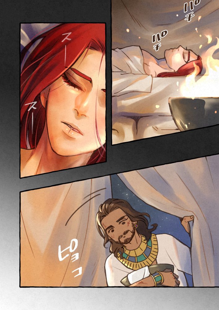 アヌビス襲撃後に髭曰く誠心誠意のお世話()にはこんな時間があってキスマークをつけたのではないか…?を想像&当時の解釈を添えて描いた髭セト漫画です。