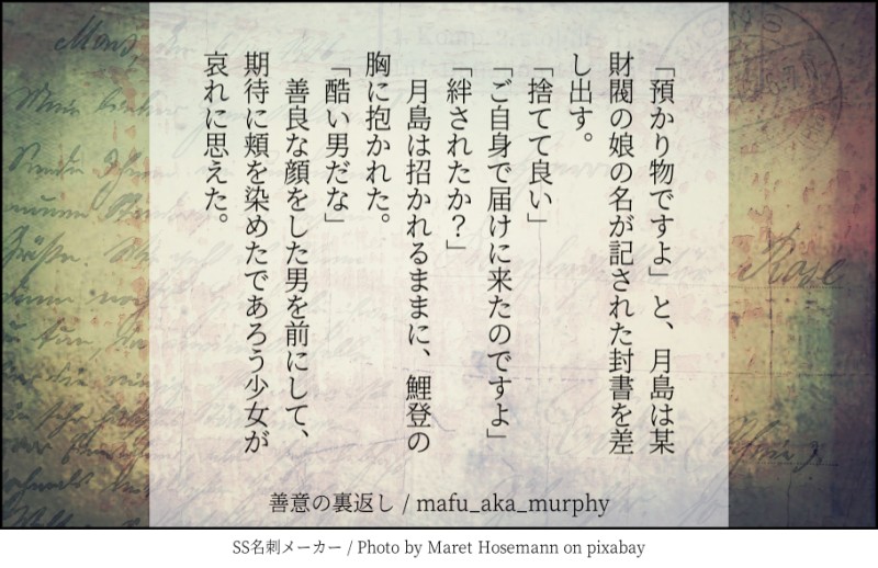 マーフィー☆quiet followTRAINING140文字で書くお題ったーから。鯉月「善意の裏返し」 #鯉月 Koito/Tsukishima Tap to full screen (size:910x590).Repost is prohibited Let's send reactions! freqpopularsnackothersPayment processing Replies from the creator Follow creator you care about!☆quiet follow マーフィーPROGRESSりょだいちゃん、少し進展しました マーフィーPROGRESSりょだいちゃんちまちま書いてます マーフィーPROGRESSりょだいちゃん進捗!すけべしだしたので成人向けです。 4193 マーフィーPROGRESSりょだいちゃんの進捗。渋谷駅で待ち合わせてからホテルに入ったまで。合計15000字いきました。成人向けになるのでワンクッションしてます 11326 マーフィーPROGRESS前回と合わせて現在1万字。最終的に成人向けになるのでワンクッションしています。前回までのりょだいちゃんは下記https://poipiku.com/900384/4570646.html 2476 マーフィーMAIKINGりょだいちゃん書きかけ。d門が女装する描写あり。最終的に成人向けになるのでワンクッションしてます。現在7500字。 7665 related works ちょめ@ChomeGKKTTRAINING診断メーカーより。CP現パロ職業メーカー「義肢装具士×官能小説家」。鯉月。月島の欠損表現あり。ご了承の上でご覧ください。 1535 uconGkDONE鯉月現パロ鯉月はどんなアイス選ぶかなと…鯉のチョイスは見た目が何か派手というところで重なった味のハーモニーは無視して映え重視月は大人なコーヒー味で☕大人なので適量サイズでシングル選びそう明治時代だとアイス、何千円もしていたらしいけど金持ってるからめっちゃグンソに食べさせてたはず!それが見たい(かき氷でも良い) rapssDOODLEぐちゃぐちゃのらくがきでもあげとくか…(なんか処理せざるを得なくなった時におくちでしてくれるぐんそう)※うちは最終回後にデキるタイプなので幻覚かifです18↑高卒済? wjfjtuu_ppINFO5/4(木)SUPER COMIC CITY 30の超黄金暗号 2023にて発行予定の「全年齢向け鯉月現パロ本」サンプルです。初めてのサークル参加となりますので部数少なめですが余裕であると思うので落ち着いた時にでも覗きにきてやってください🙌 15 kamman_gkmMOURNING9/24に出した『めざましがなるまえに』の没原稿です。本当はこんな鬱々とした感じで始まる話でした。月島がかなり元カノちよちゃんに未練タラタラで、孤独を拗らせているのでご注意ください。時間もないし全部まるっと没にしたけど、いつか再利用できたらするかも。 4301 ジュペリDOODLEご都合新薬で ツキシマのお乳だけ大きくなっちゃった鯉月パスワード 18歳以上ですか→yes / no JjjianXDOODLE人体很烂,orz,壮年鲤月!!浦西月!!但还是请给我点小心心!不多!十个! taz_netabaMENU鯉月/モブ月※R1820230924 黄金暗号おしながき既刊(棒)¥400、無配、コピ本¥100(まだ描いてる)に加えて12月の新刊予告・両面ペーパー頒布予定です〜匿名にわとりさんとの描き下ろしには☆たのしい工作☆数量限定「鯉月クソコラセット」のおまけつき!ぜひ切って貼って遊んでくださいね!提案された途端爆笑してしまいました…斬新過ぎる…!★18歳(高校卒業)以上ですか? 5 松型ひとななCAN’T MAKEなんとか描けた recommended works ichimi103DONE鯉月 ichimi103DOODLE鯉登と鯉月と鯉登 3 auie000DOODLE鯉月授乳?まんが231話より前と後の鯉月のイメージ鯉登パパとのるのしんくん 3 kebadachi_kebaDOODLE毎年気温が25度を超えると解禁する曲※月女装 funo9ryunosukeDONE現パロ鯉月の短いお話。※このお話は、2021年5月に書いたものです。 4 sabah_thesonPROGRESS鯉月(セリフなし)軍曹会議用微エロです etieti_gabrielDOODLEこれにする!!!(支部のせるとき) 🍼🥪🦜REHABILIthat one snowy night 🌨 etieti_gabrielDOODLE変な部屋に閉じ込められた鯉月 3
