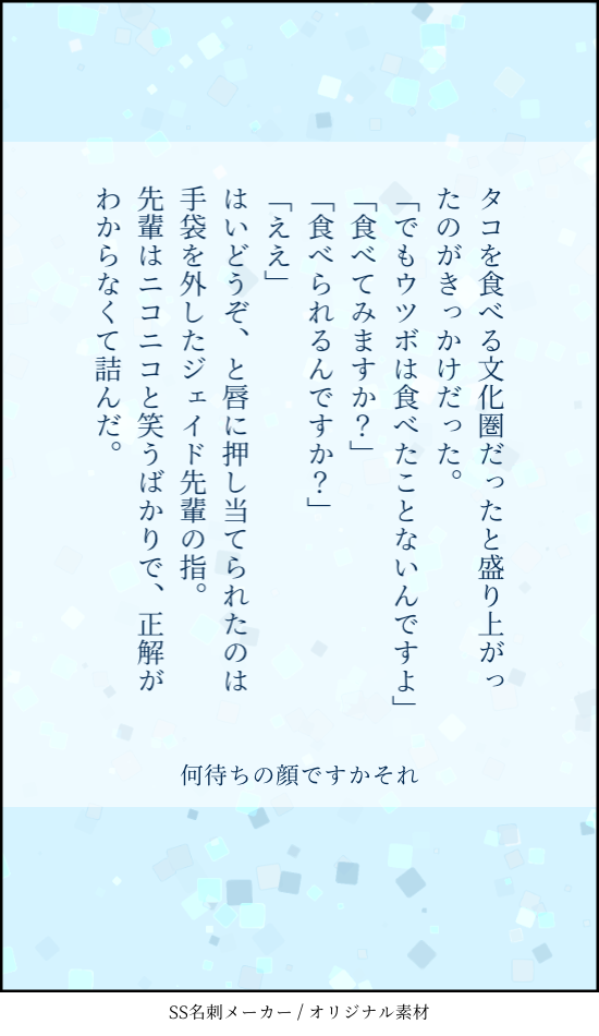 uncle_jam1☆quiet followDONEジェ監/茶目っ気 #ジェ監 Tap to full screen (size:550x950).Repost is prohibited Let's send reactions! freqpopularsnackothersPayment processing Replies from the creator Follow creator you care about!☆quiet follow uncle_jam1PROGRESS花街/バッドエンド/習合オチ/エロ薄め 5828 uncle_jam1MEMO刀さにで古備前サンドが成り立つ組み合わせについて考えた。下ネタです。 2552 uncle_jam1PROGRESS花街/バッドエンド/習合オチ/エロ薄め 4756 uncle_jam1DOODLE書くかもしれない大さにプロット(花街)花街大包平→審神者→本丸大包平 の関係 3048 uncle_jam1MOURNING書かないうぐさにのプロットというかメモ。出られない部屋/事後/付き合ってなかった ぐらいの 949 uncle_jam1PROGRESS書くかもしれない。大さにプロット 2184 related works riverside_modTIRED🦈→🦐←🐬のサンドの一部。男装がバレるという18537426回くらい書かれてる話。🔞(3P)予定だけど終着点がなかなか見つけられないので一旦ネタで放置。最終的にどちらかに矢印は偏ると思う。 4 みょんDOODLEエー監とジェ監エー監→身長差の話、お泊まり時空ジェ監→コソコソ話、仲が良い 2 lien🦐MAIKING前に言ってた過去に戻りたいジェの話 【一節】まだまだ続くよ〜 7 kros21fcDONEジェイ監♂/ジェ監♂ ちょっとえっち。 みょんDOODLEジェ監、監顔あり、ジェが溺れないように手を握ってくれながら海でランデブーする🐬🌸 riverside_modTIRED【ジェ監♀フロ監♀小説】ひとつ前にふぉろわさん限定でpostした🐬→🦐←🦈の話のR-18部分。男装監督生の秘密を黙っているかわりに、の話。3人で事に及んでいます。18歳未満(高校生不可)は閲覧をお控えください。だめだよ。パスワード:18歳未満(高校生)ですか 4 葉づきPROGRESS12月13日に発刊予定のジェイ監♀(男装監督生)R18小説の冒頭部分という進捗……まだここまでしか書いてないんですが……応援リアクションもらえらた嬉しいです…… 2297 uncle_jam1DONEジェ監/茶目っ気 葉づきPROGRESS12/13ツイステオンリー スペース頂きました!南3 ソ02aで頒布予定のジェ監♀R18小説の作業進捗パート②です!※前回あげた作業進捗の続きから始まってます!! 2984 recommended works ツグミDONE 葉づきDONE #葉づきエアスケブ小説企画ニンコパ会場でのリクエストありがとうございます!リクエスト:「嫉妬」 アズ監 ジェイ監アズールジェイドとの事だったのでこの2人とサンドにしました!「僕、監督生さんに告白しようと思うんです」ジェイドに告げられたその一言に僕は思わず低い声で「は?」とだけ返した。ドクドクと鼓動が煩い。心拍数が上がって、喉が乾いていく。目の前のジェイドはニコニコと笑みを深くして未だに薄ら寒い笑みを顔に貼り付けている。「……何故僕にそんな事を言うんですか」「いえ、一応あなたにも知っておいて頂こうかと」「どういう意味です? 勝手にしたら良いでしょう?」「えぇ言われなくとも勝手にはします。アズールはどうするんですか? まぁ僕としてはこのまま黙って諦めて頂けると一番嬉しいのですが」「……おまえ……」「ふふ、そんなに怖い顔をしないで。僕達、同じ陸のメスに恋した仲じゃないですか」「……知ってて僕を煽っているのなら、本当に良い性格をしていますね、おまえは」「ふふ、ありがとうございます」「褒めてない。……良いでしょう。お前がそのつもりなら僕だってあの人を手に入れてみせる。ジェイド、おまえにだって譲ってなんてやりませんよ」「そうこなくては。僕も絶対に負けるつもりはありません」ニヤリと笑うジェイドの眼光がギラリと鈍く光る。敵意に溢れたその顔は 1382 shira_su_twstDOODLE「貴女に、会いに」監督生の部屋の鏡はスリムミラーなので肩幅が通らず、ちょっとカッコ悪い再会で二人で笑っていたらいいな スピノPROGRESS冬コミ発行ツイステ画集用ブラッシュアップ進捗⑦ yumaDONE🔞【◯◯部屋】ジェイ監🐬🌸⚠︎付き合っていない⚠︎突然始まり突然終わる⚠︎本番なし⚠︎ユウ呼び有りフェ◯しないと出られない部屋パスワードはyumaの誕生日4桁 9 yumaDONE🔞【料理中の小エビに悪戯をするフロイドの話】🦈🦐⚠︎大人の2人同棲中⚠︎突然始まり突然終わる⚠︎ぬるい⚠︎落ちた食材は🦈がきちんと調理しましたパスワードは私な誕生日4桁です 6 chocorocotanDOODLE*cuntboy ocpass: 18+? (yes/no) 3 きょうMENU========𝗖𝗮𝗹𝗹 𝗼𝗳 𝗖𝘁𝗵𝘂𝗹𝗵𝘂 ━ しんでなんかないよ〰️ᴋᴘᴄ きょう - 六角 御幸ᴘᴄ パンくずさん - 雨洞 一二三〰️𝗘𝗡𝗗.こげぬ継続しんない回してきました!一二三は良い男だなとあらためて認識しました・・・「中華料理食べたいなあ」 MaoSimon29picDOODLE【ぶち バディ 落書き】目の赤いやつバディぬいの目の赤いやつ すき っていう 落書きpass 見る?y/n 2