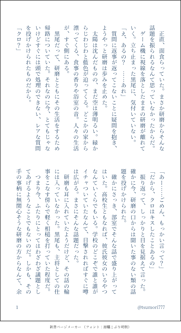 つもり☆quiet followDOODLE高校生黒研。黒尾くんを混乱させてみる。 show all(+4 images) Tap to full screen (size:618x1132).Repost is prohibited Let's send reactions! freqpopularsnackothersPayment processing Replies from the creator Follow creator you care about!☆quiet follow つもりDOODLE黒研。猫舌。大人。 3 つもりDOODLE影日、若干黒研。Dom/Subユニバース。世話焼きの菅原さんがメインです。 5 つもりDOODLE黒研。気付いた瞬間。 3 つもりDOODLE黒研。大人。事後が事後じゃなくなる瞬間。 4 つもりDOODLE黒研。付き合いたて高校生。「愛しい」って無自覚。 4 つもりDOODLE黒研未満。黒尾くん高二、研磨くん高一。 4 recommended works カカオDOODLE #えっちな推しカプ#みんなのボタンメーカー※炭善※ヤッてるだけ※失神⚠︎R18!成人済ですか?(yes or no) 2 ハナモDOODLE3RTで性癖絵を描く#絵師強制ボタン#みんなのボタンメーカーhttps://btnmaker.me/b/a38c9fa0-07de-11ec-9878-055a350dba0d↑というお題が来たので今までなんとなく黙っていた部分を吐露した ポイピクミッシェルさんDONE月イチ企画第三弾です。「匂い」の相性ってとっても大事らしいです。そんなsgoのお話です。ちょっとえちちなので大人の方限定です。18歳以上ですか? 3600 kmusaDOODLE13♡で泡だらけの推しカプをかく#すけべな気持ちの推しカプボタン#みんなのボタンメーカー♡ありがとうございます!泡風呂音セシちゃんになりました〜シャーペンで描いて色塗りはクリスタipadAirを使いこなす練習 takeyamaryuDONE🥃⚡⛓ #HerAlca3rtされたら推しをロリorショタにさせましょう#絵描きさんのボタン#みんなのボタンメーカー usaginoaramasaDONE⚠現パロ・肌色注意⚠今日の馬族[20231024]ボタンメーカーさんより白衣を着た推し…馬岱先生です。メガネは個人的な好みで白衣の下は…実は勢い余ってインナーを描き忘れてたのであとからソッと足したのナイショだよ!そんな裸白衣バージョンもおいておきますね… 2 nyu_seihinnDOODLEすおさくにれ 🐱🫖🌸📝「飼い主のもの、毛だらけ」猫の毛は細いからコロコロ必須ですね〜🥰 2 アルビレオPASTコメントいただいたので井宿&張宿も再掲☺️これも気に入ってる絵です😁2人の髪の色を2色にしたのがこだわりポイントです。ポップな感じになったかなと絵の投稿方法を外部リンクに変えて、閲覧数、リアクションが変わった時期だったので、私も反応がよく分からずなところがありました。ポイピクは絵文字ポチポチがとてもかわいく嬉しいですし、外部リンクで面倒なのにいいね下さる方もホントありがとうございます nyaaaaan__0302DOODLEぺた ぺた