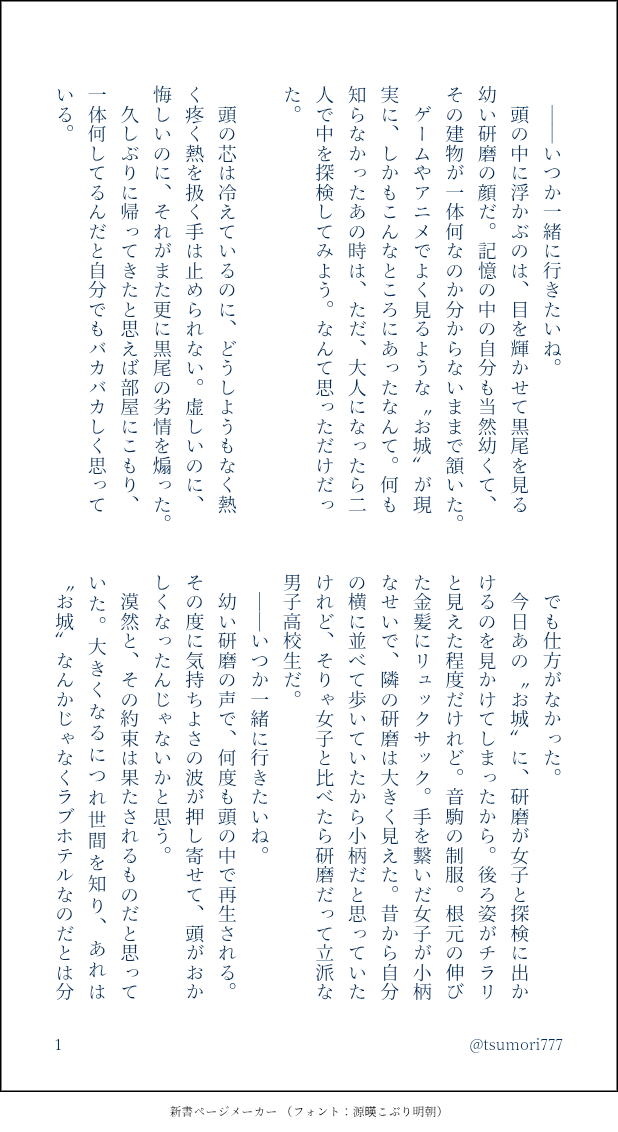 つもり☆こそフォロらくがき黒研。人様にネタを頂きました。大一×高三。 すべて表示(+3枚) タップで全画面(原寸:618x1132)無断転載禁止 リアクションをたくさん送って応援しよう! よく使う人気おやつその他支払処理中 作者からのリプライ 気になる人をどんどんフォローしよう!☆こそフォロ つもりらくがき黒研。人様にネタを頂きました。大一×高三。 4 つもりらくがき大人の黒尾くんと研磨くん。付き合ってない、恋心もない。普通の幼馴染。ブロマンス。 4 つもりできた右から左に読むと研磨くん目線。左から右に読むと黒尾くん目線。黒研ワンドロライ、最後の参加作品。主催者様、お疲れ様でした。 つもりらくがき黒研。ポッキーの日。付き合ってない。 4 つもりらくがき 7 つもりらくがき黒研。大人。 4